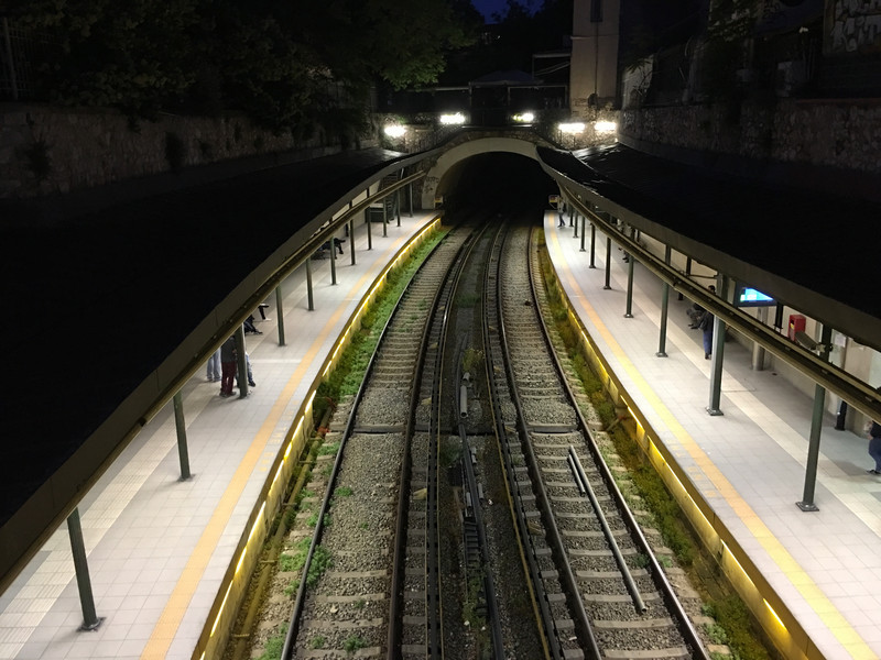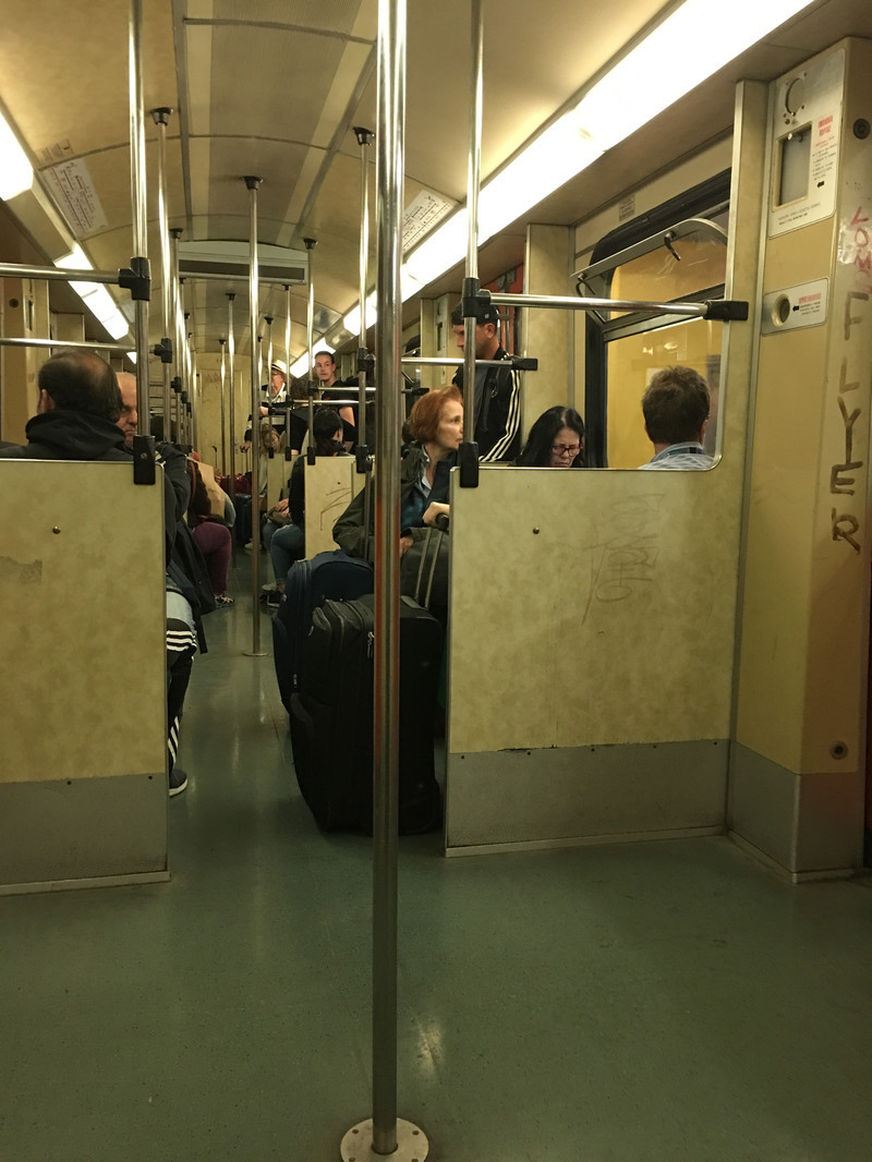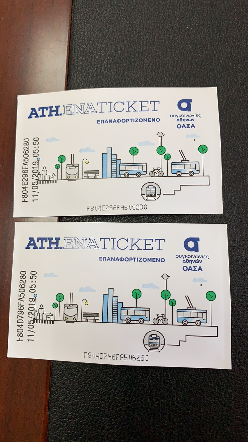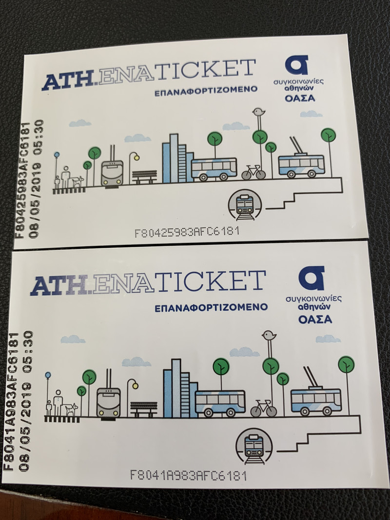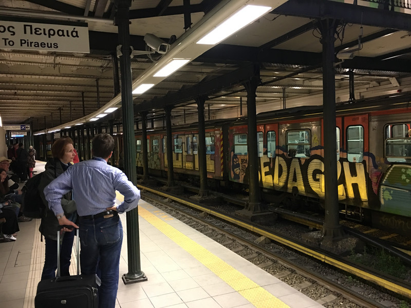 地铁票,是不是感觉和巴士票长得一样啊,哈哈。进出也是刷一下即可 Monastiraki站进站后 被乱涂鸦的好破的地铁啊 原来雅典地铁每节车厢是不通的啊,早上人少基本都有座位,一路很安全啊,所以只要大家稍加注意,问题不大。 地铁Piraeus站到达1号线终点站Piraeus港口站后,网上说过天桥去取票,但是我们碰到天桥维修都被围挡起来了。从地面跟着人流走2-3分钟就到码头了。拿着国内预定好的船票确认单到对应的船公司售票亭换取船票,相当方便。