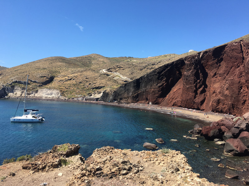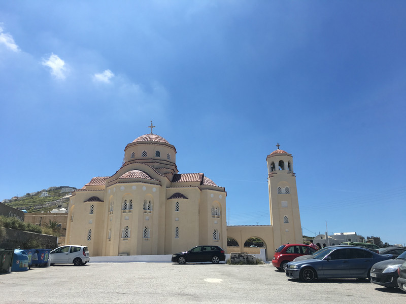 圣岛概览图 经过这个盘山公路,去山顶看古锡拉遗址(圣岛古称锡拉) 小菲大鹏展翅 门票居然要4欧/人,4月1号开始涨了一倍,有点不值啊。 花钱爬山,好累 山顶古迹的古城中心 不知道叫啥教堂,好多人下车观看 岛南部看日落吃晚饭的一个佳处 红沙滩,爬上去的路简直就是人多了踩出来的,政府也不修一下 圣岛最南端的灯塔傍晚开车到圣托里尼菲拉小镇住两晚,小镇中心好多单行道,开车要注意,游人也很多。