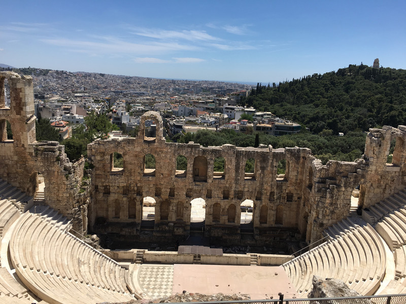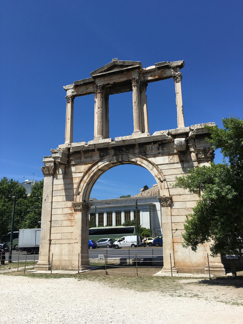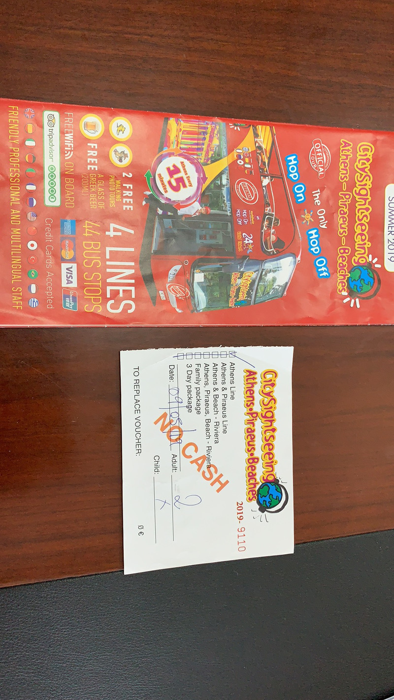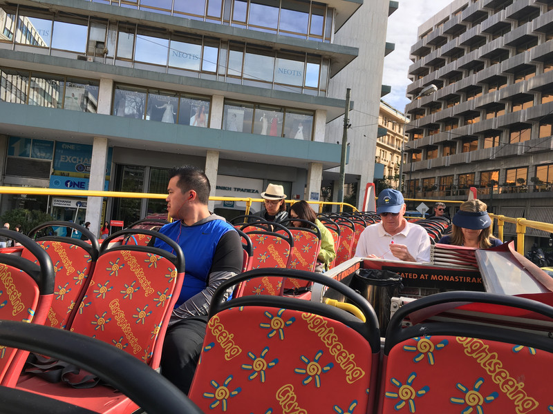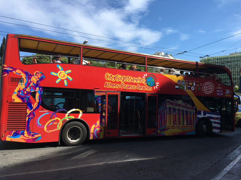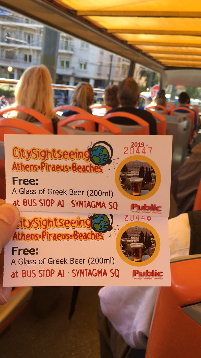分为红线、蓝线。我们购买的红线是雅典市区环线,共15个站点,随上随下,蓝线要更远一点,可以使用2天。还有发一付免费的耳机,上车后调至11频道就是中文讲解,途径的景点、重要建筑、历史都会讲到。 还送了2杯啤酒,就在第一站后面的PUBLIC楼里领取 免费的啤酒 坐在顶上有太阳的时候很晒啊。 Monastiraki站周边的古代市场遗址(Ancient Agora)。 宪法广场 观看每个整点的卫兵换岗仪式 奥林匹克公园 有钱人的豪宅,现在变成博物馆了 雅典大学 国家图书馆 哈德良拱门 宙斯神庙雅典卫城门票,现场购买20欧/人,一年中有几天是免费的,欧盟公民和留学生还可以买优惠票。