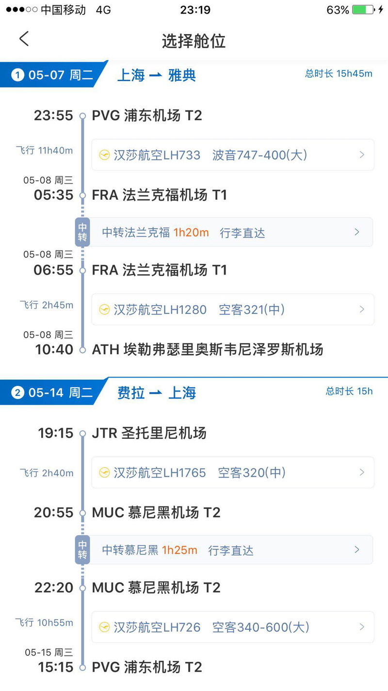 准备就绪,就等待出发啦。这里分享一点小经验:汉莎航空规定金卡会员以上才能提前免费选座,但是问了度娘发现飞机起飞前23小时开放所有人的免费选座,所以肯定要提前选个较舒适的座位啊,因为查询后得知747单独2个座位一起的不是很多,第二程航班只需2.5个小时,座位要求就没这么高啦。但是后来回程碰到个小问题,提前选好的位置在圣托里尼机场柜台被工作人员改掉了,一开始都没注意,第一程还两人分开隔了近20排,还好第二程是空客340飞机(2-4-2客舱布局),改掉后还是2人一起的座位,只是比预定的也后了近15排。