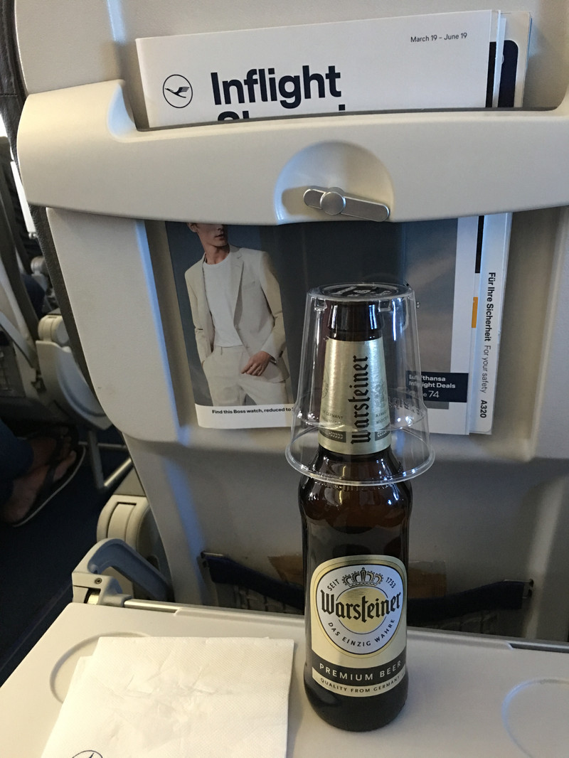 还车后走到机场,还有4个小时起飞,工作人员不让进,说只能起飞前2小时进去,只好边上坐着干等。进去才知道机场太小了,一个航班的人的座椅都没有,大多只能站着等。还有就是把我预选的座位改掉了,也没征求我意见,莫名其妙啊。 圣岛飞慕尼黑的飞机来了 返回上海的飞机 飞机上喝了一瓶啤酒,味道很正,没敢要红酒和干白,下机后还要开车的。总的来说,这次希腊之行很顺利,自由行希腊是非常不错的合适选择,爱情海边留下了我们的足迹,“世界那么大,多去看看”,期待下一次旅行!