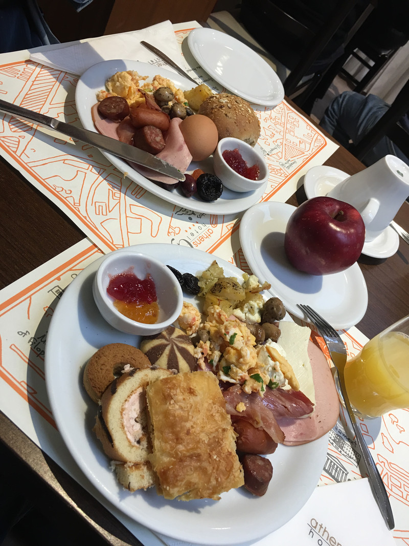 普瑞亚酒店 普瑞亚早餐厅入口处陈列的一些希腊老古董用品。 普瑞亚酒店早餐。酒店周边是繁华的市中心雅典普拉卡老城区