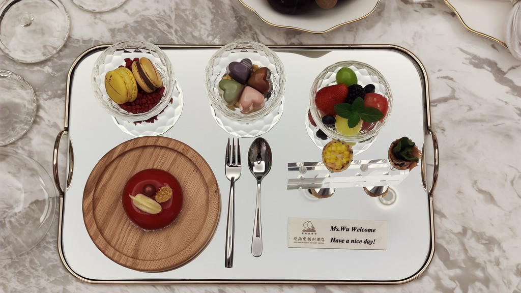 以轻食健康餐饮为主,提供酒水、软饮、糕点及高端下午茶服务的大堂吧是珠海度假村酒店星海楼里一个蛮休闲的存在,无论是中式茶水、鲜榨果汁、软饮;咖啡、气泡酒、红葡萄酒、白葡萄酒还是台式面包、欧式面包、俱乐部三明治、意式帕尼尼、甜甜圈、马芬、各式甜品和杯装冰淇淋,在这里都能享用到。如果想带走一些譬如中式饼仔、桶装西式饼干、盒装马卡龙、盒装巧克力、礼品篮套装的小礼品也很方便,生日蛋糕的话就要预付款提前48小时订购啦!