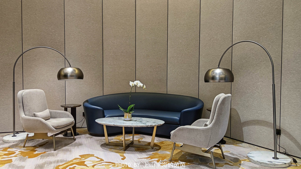 “午后航海”主题的商务会客场以木质皮质为主的艺术品材质,海水般流动的地毯、中性灰色为基调搭配理性的蓝色的家具灯具,营造出低调奢华满满高级感。