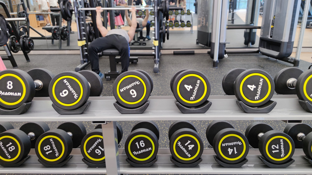 体测仪(BODY)、镀铬哑铃及哑铃架子(JOINFIT捷英飞)和8方位专用图案地垫(英利奥),细节中透着专业!
