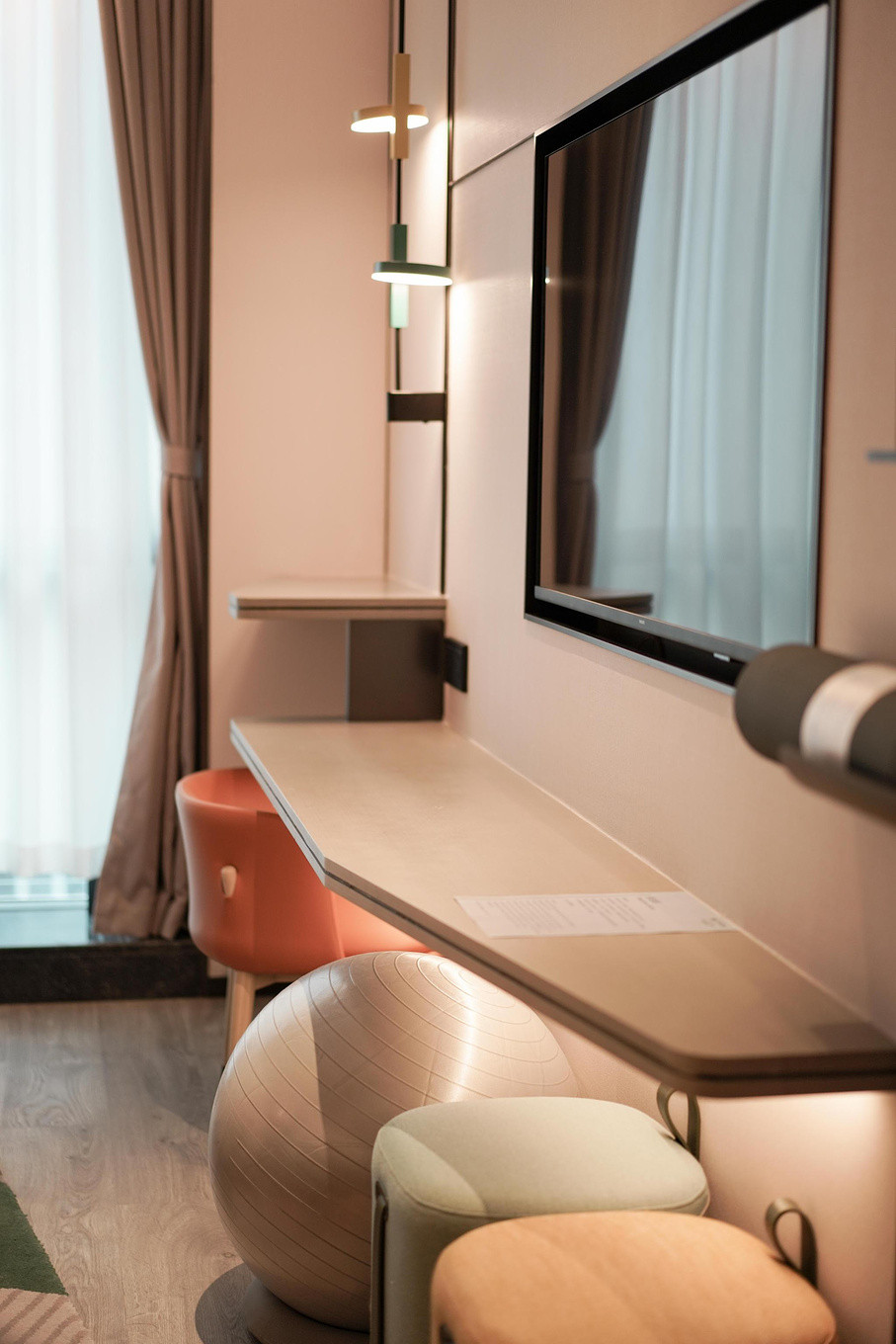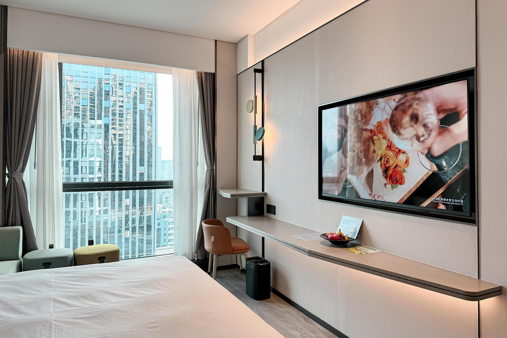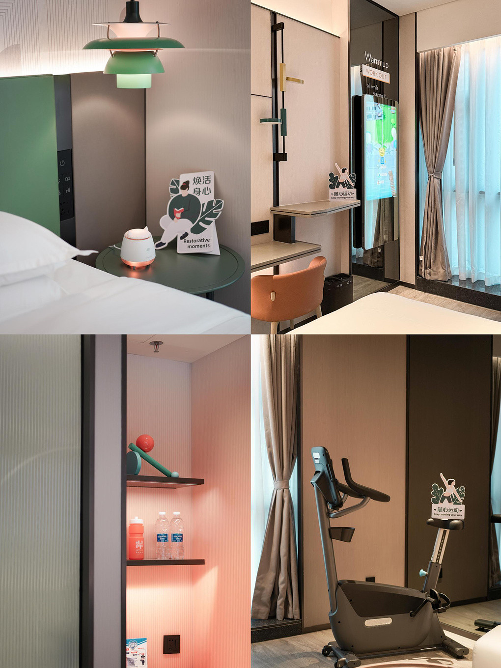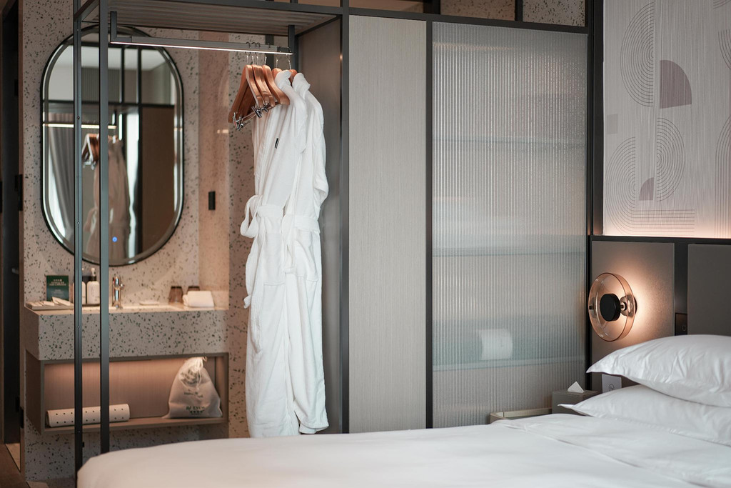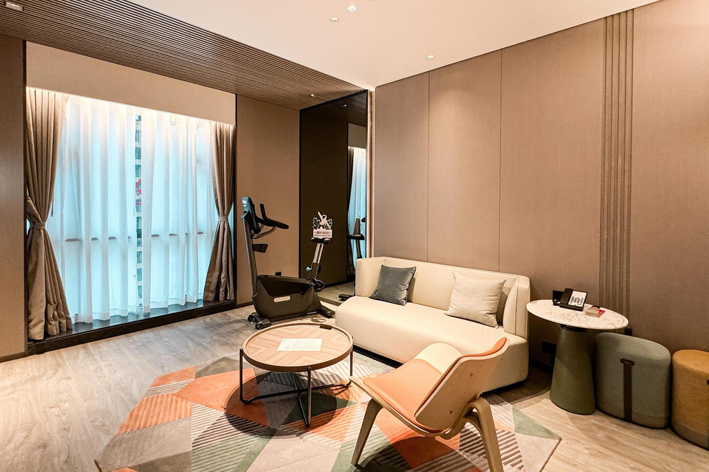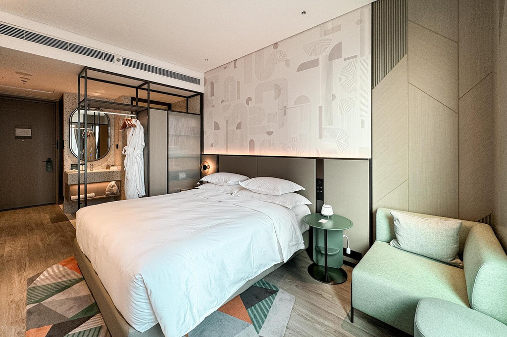 客房设计极具现代感,格调温馨、配色时尚、线条流畅,客房背景墙以运动线条及几何图形设计,打造出别致的格调空间,给人一种舒适健康的空间感。客房内的每一处细节都让人心生愉悦,无论是多功能红点设计香薰睡眠灯,还是澳洲Milk&Co亲肤洗浴用品,在细节处让宾客放松身心,拥有舒适的入住体验。