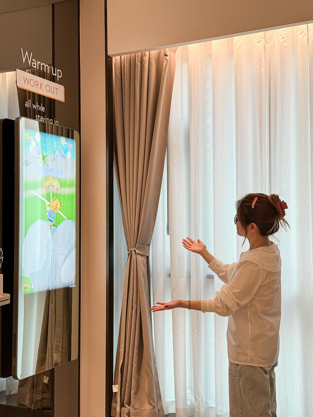 中山中心逸衡酒店处处凸显绿色健康理念,每个客房都配备有瑜伽球、瑜伽垫、瑜伽砖、按摩滚轴及拉力绳等健身器材,还有部分房型还配有智能健身镜或动感单车,可以和镜中的视频一起进行有趣的运动游戏,还可以踩动感单车进行发电,超级有趣!