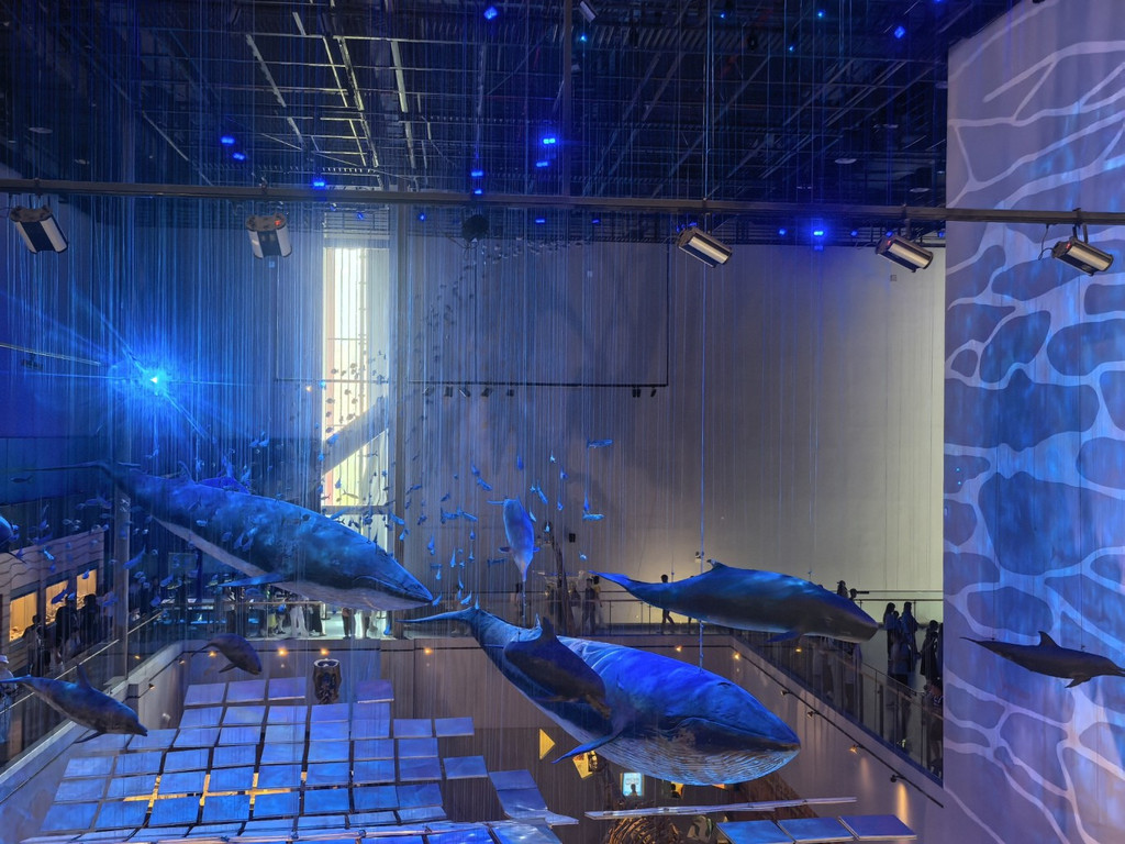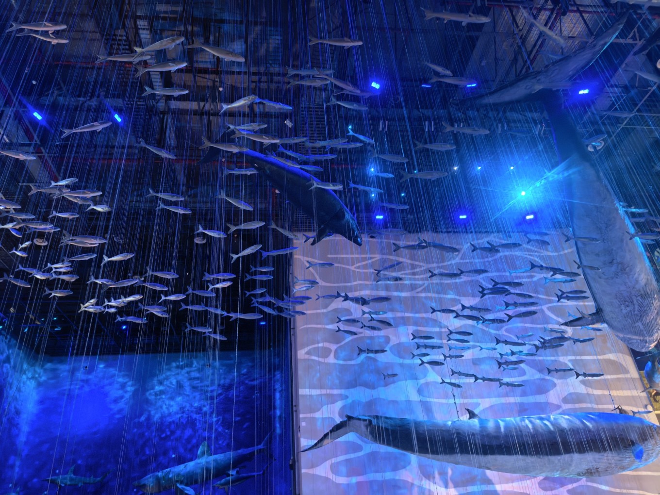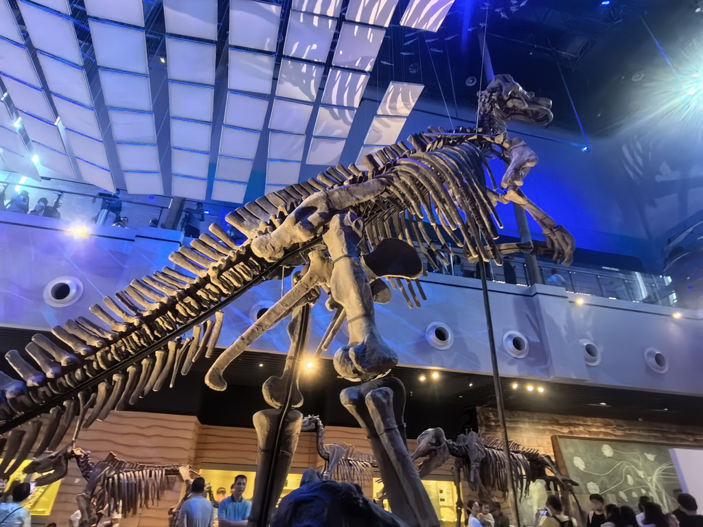 海洋馆、古生物馆,悬挂着海洋动物标本,海洋动物如同正在蓝色的海洋中,蓝色真的好治愈!最出片的海洋馆就在这,真的好震撼!海洋动物标本下面就是恐龙化石,一整层的海洋动物和恐龙化石,巨大的恐龙骨架超震撼。有点儿类似于自贡的恐龙博物馆!