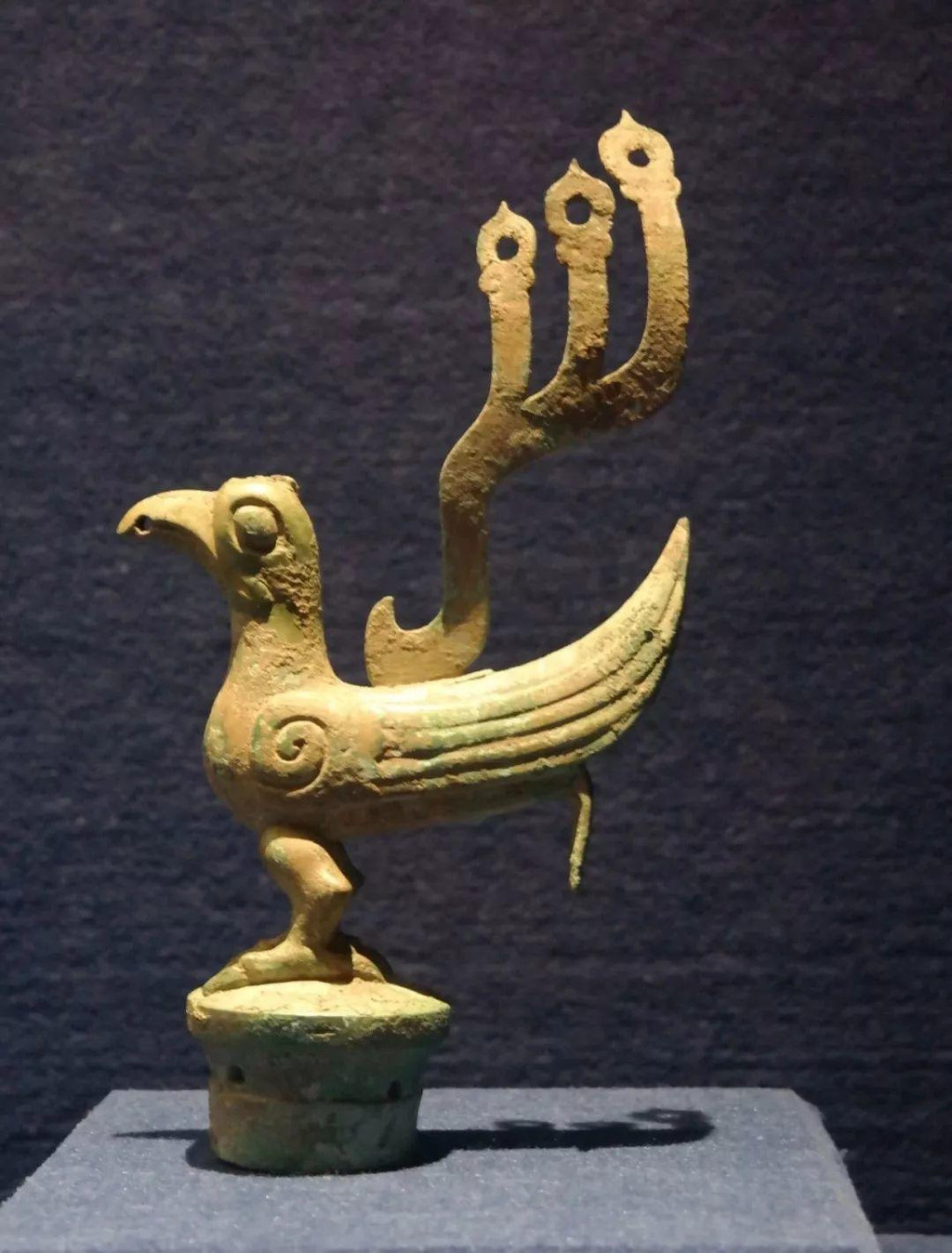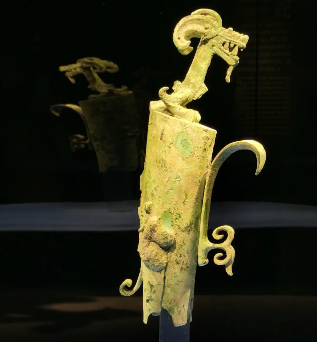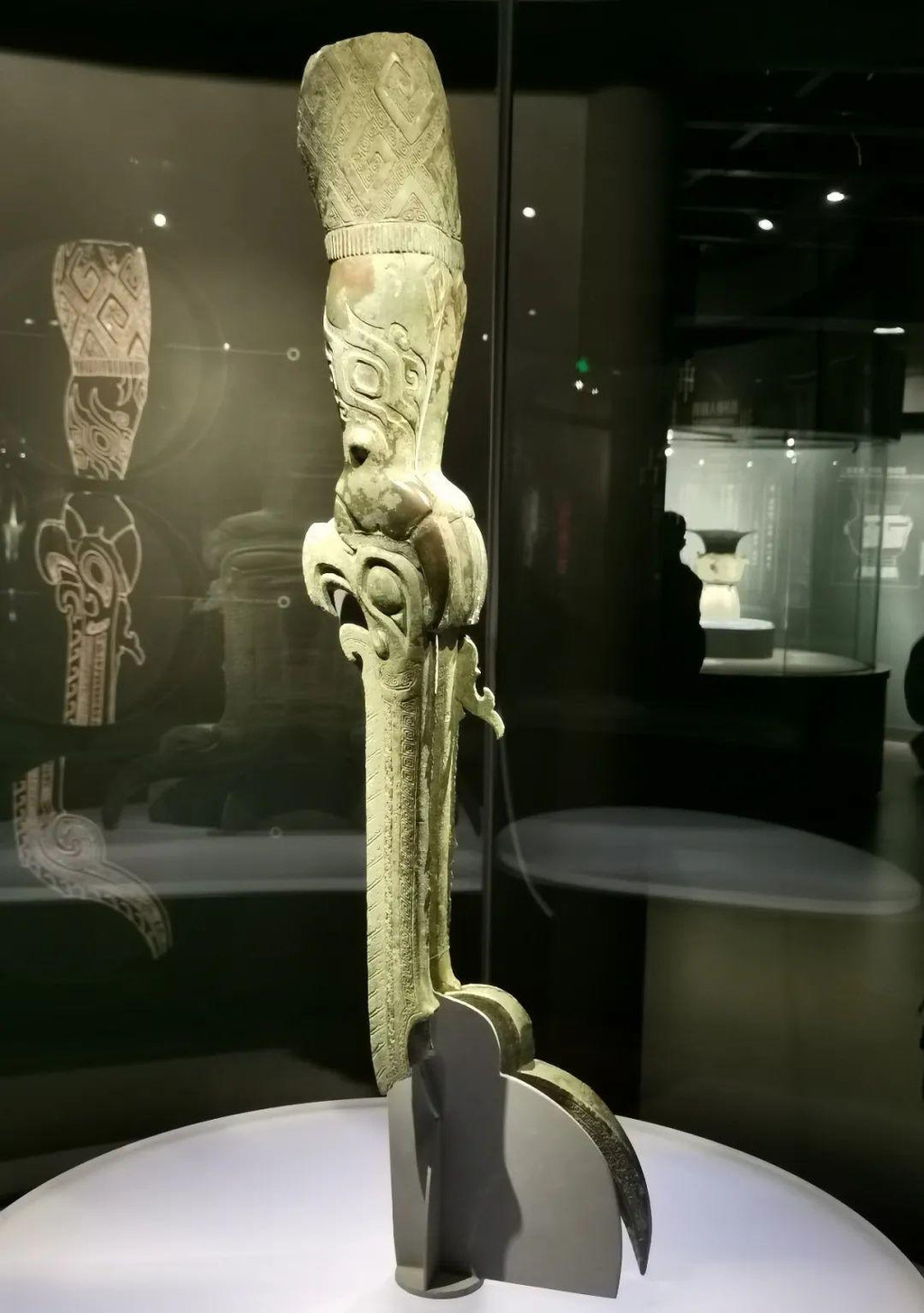下图为青铜鸟脚人像,以嵌铸法将人体和鸟头铸造在一起,人上半身和鸟尾端残段无存。其造型奇特,或为某位天神。