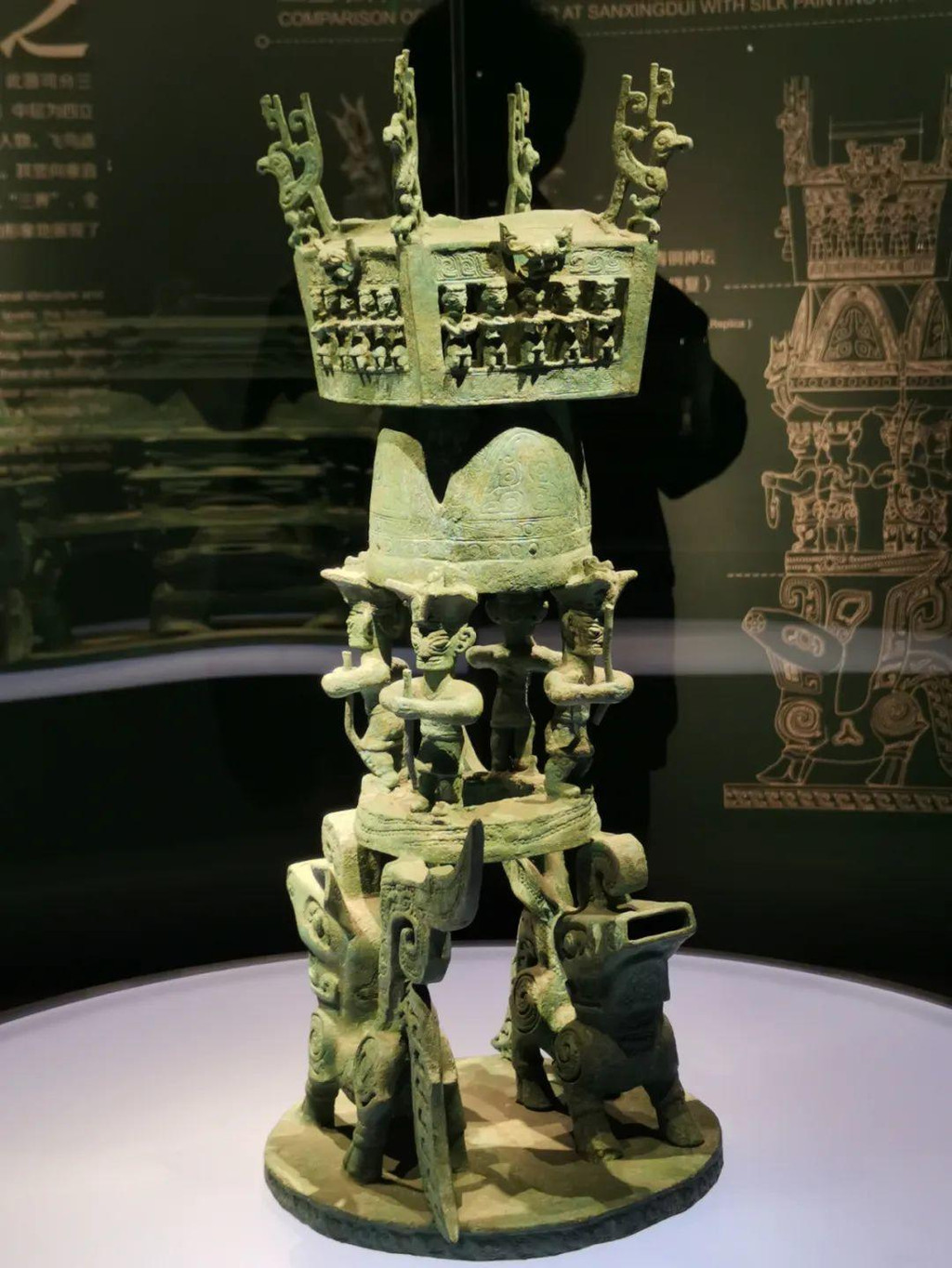 下图为青铜神坛:其造型奇特,内涵丰富,底层是一对首尾相接的神兽,中层为四立人及头顶的山峰,上层有建筑、人物、飞鸟等,竖向垂直展开的时空序列表征天、地、人三界,全器似有旋转动势,生动展现了古蜀人的神话宇宙观。