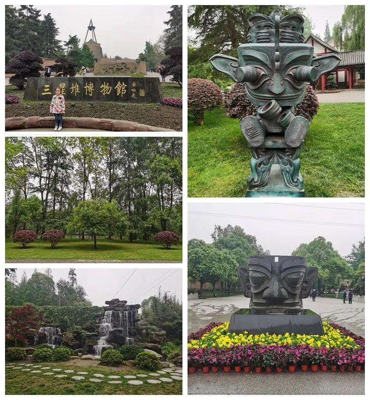 三星堆博物馆展馆之间还有大片的草地、湖水以及祭祀台、仿制青铜雕塑等景观,畅游历史的同时,在鲜花绿草的秀美风景中散步怀古也不失一种美好的体验。