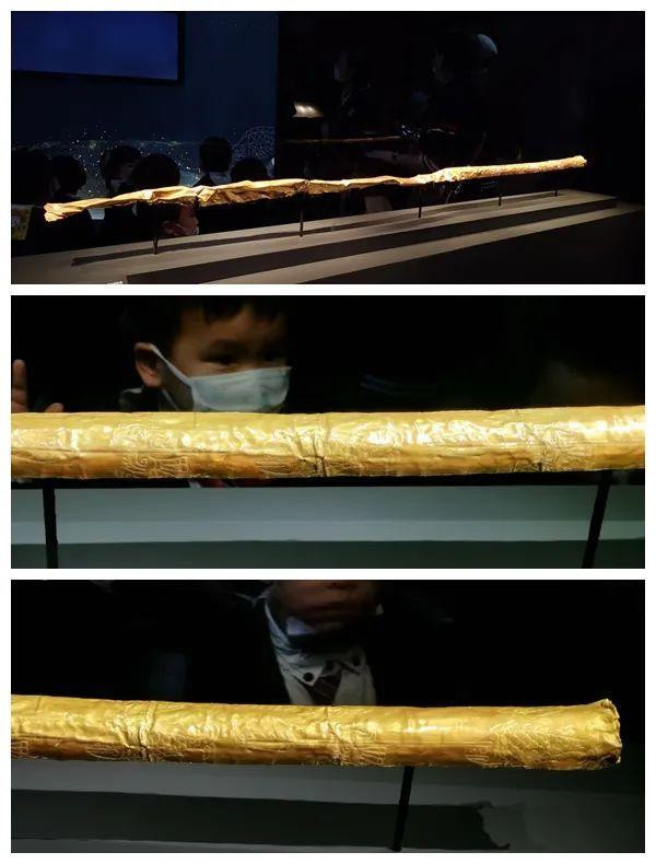 下图为商代晚期的金杖,采用金条捶打成金皮后,再包卷在木杖上。其一端錾刻有一段长约46厘米的三组图案,分别为两个前后对称的巫师头像、鱼和鸟,专家认为这象征多种特权(王权、神权、财富垄断权等)集于一身。