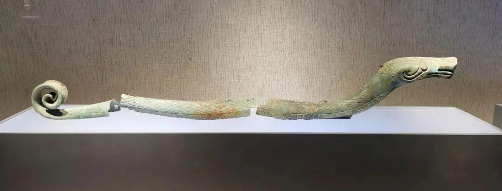 下图为青铜龙蛇:龙身细长如蜥蜴,龙头大耳犄角,下巴有胡须,类似羊头;青铜蛇体型硕大,颇具写实风格;古蜀文化的独特性在龙蛇造型上亦可见一斑。