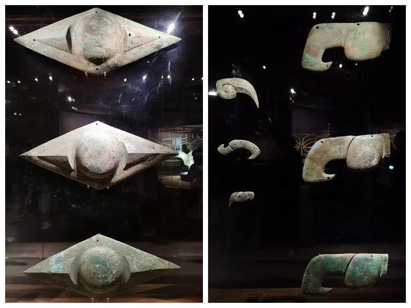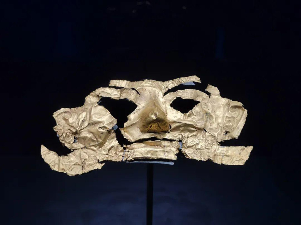 下图为商代晚期的金面罩,一般与铜人头像配套,春晚《金面》舞蹈着重体现了这一文化元素,演员都佩戴有金面。这种金面罩与古希腊、古埃及等地区的金面罩外形相似,有学者认为这是三星堆吸收西亚近东文明的产物。(下文会展示头戴金面具的铜人头像)