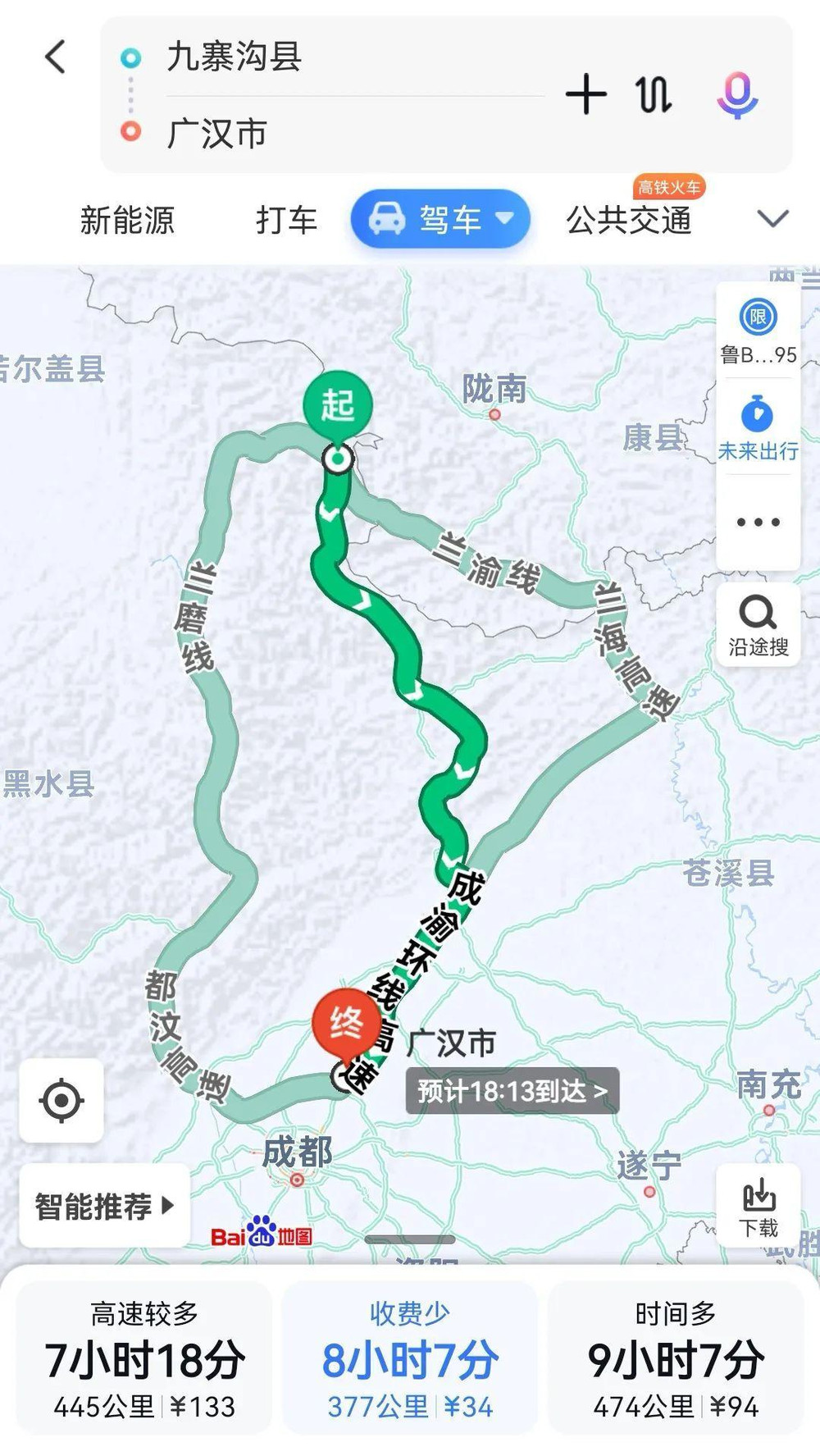 导航显示,九寨沟县到广汉市有三条线路,左右两条线都有高速路段,但距离长、收费多,所以尽管左线用时更少,大部分人都会选择中间的线路吧。