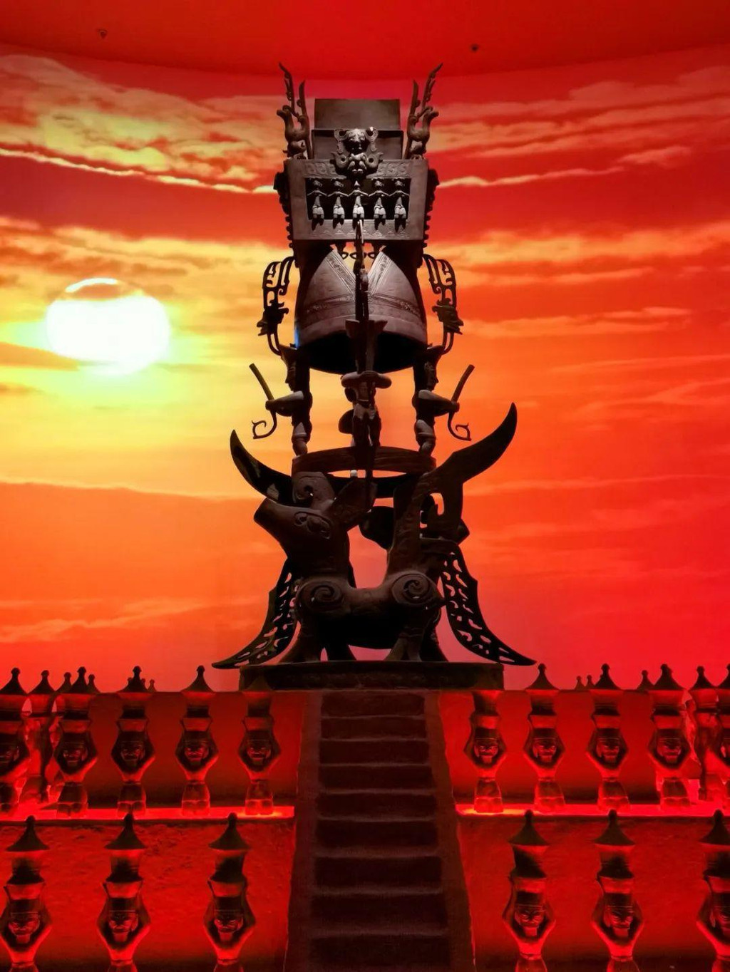 下图为祭祀大典场景,出土于二号祭祀坑,图中展示为放大6倍的仿制品,形象演绎了3000多年前古蜀国举行祭祀仪式的隆重场景。