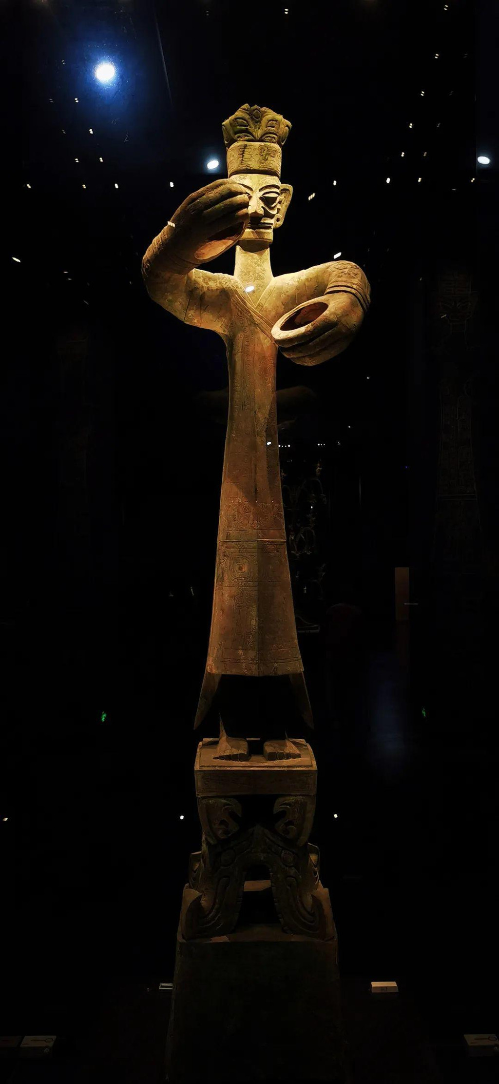 三星堆文明关于祭祀最神秘的文物要属下面的铜大立人像:铜像基本按真人比例塑造,对眼、耳、双手作了夸张,以此强化人像超凡的一面,似乎是表现一个具有通天异禀、神威赫赫的大人物正在作法,人像站立的方台可能是神坛或神山;目前专家认为大立人像是三星堆古蜀国集神、巫、王三者身份于一体的最具权威性的领袖人物,是神权和王权最高权力的象征。