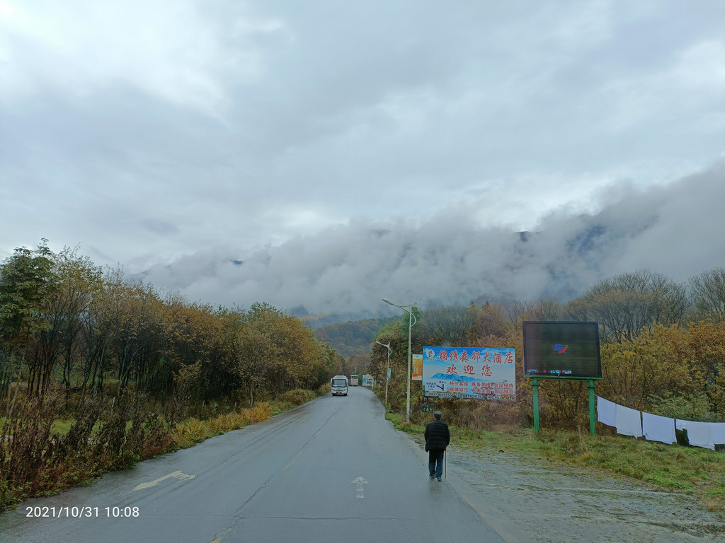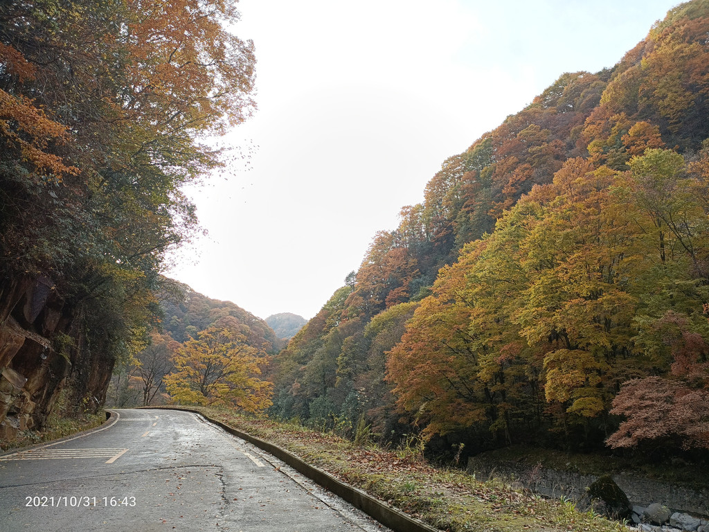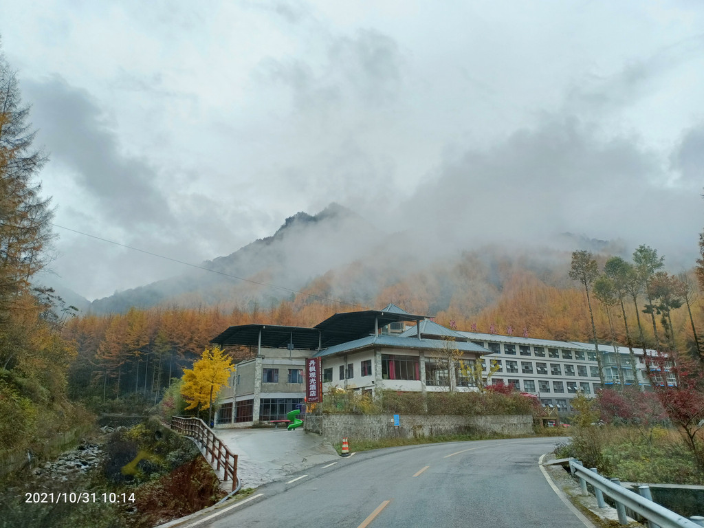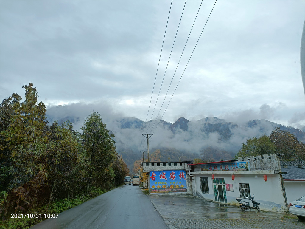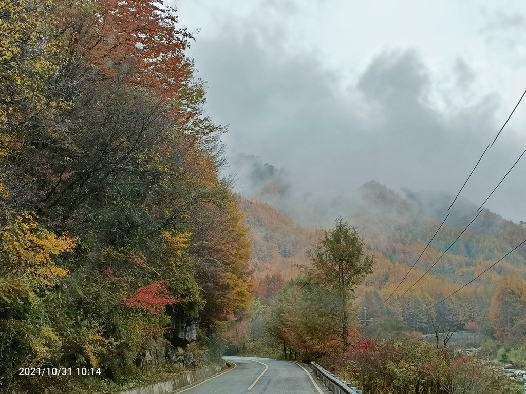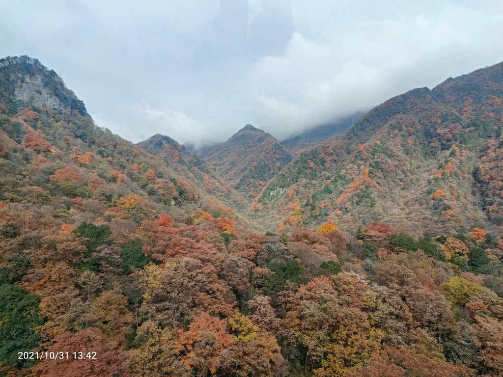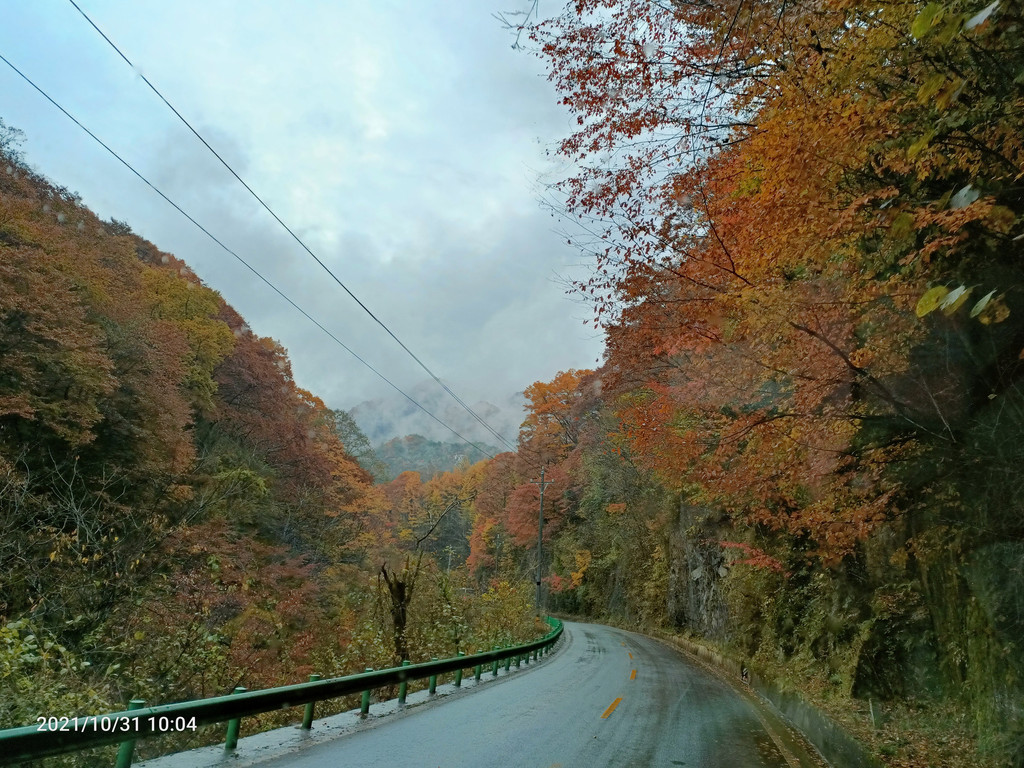 这是天然画廊到牟阳古城一路上的风景,虽然下雨,但是起雾山间又别是一番风景,只是我的手机像素有点渣,实际上看起来是非常壮观的,因为是大巴车,所以最前面有个位置,后面每次换乘我都是坐最前面去,视角真的非常好,如想拍摄一路上的风景最好是坐这个位置,当时看到这云雾缭绕的我非常想下车去拍,可是师傅不停(其实这个地方是可以停车下人的),所以只能车观一下了,我问师傅这是坐到哪里去,师傅说是拉到香炉山去坐索道,我心想索道不是自费吗,拉过去不坐的话那去香炉山干嘛呢,当时车上的人就在议论,所以在经过黑熊沟的时候师傅就停车了,说不去香炉山的就在此下车,我们就下来了,当时我确实不想去坐索道的,因为在之前了解红叶的时候是香炉山 上的最先红,我心想距离我来已过去许多天红叶估计都掉了,而且当时还是阴雨中,上去万一大雾什么都看不到,就作罢了先游览黑熊沟吧,也就是这一决定,后面就有悔了,因为到中午的时候就云开雾散出太阳了,想着来都来了,可不得坐索道在空中看一番漫山红遍,层林浸染的光雾山吗