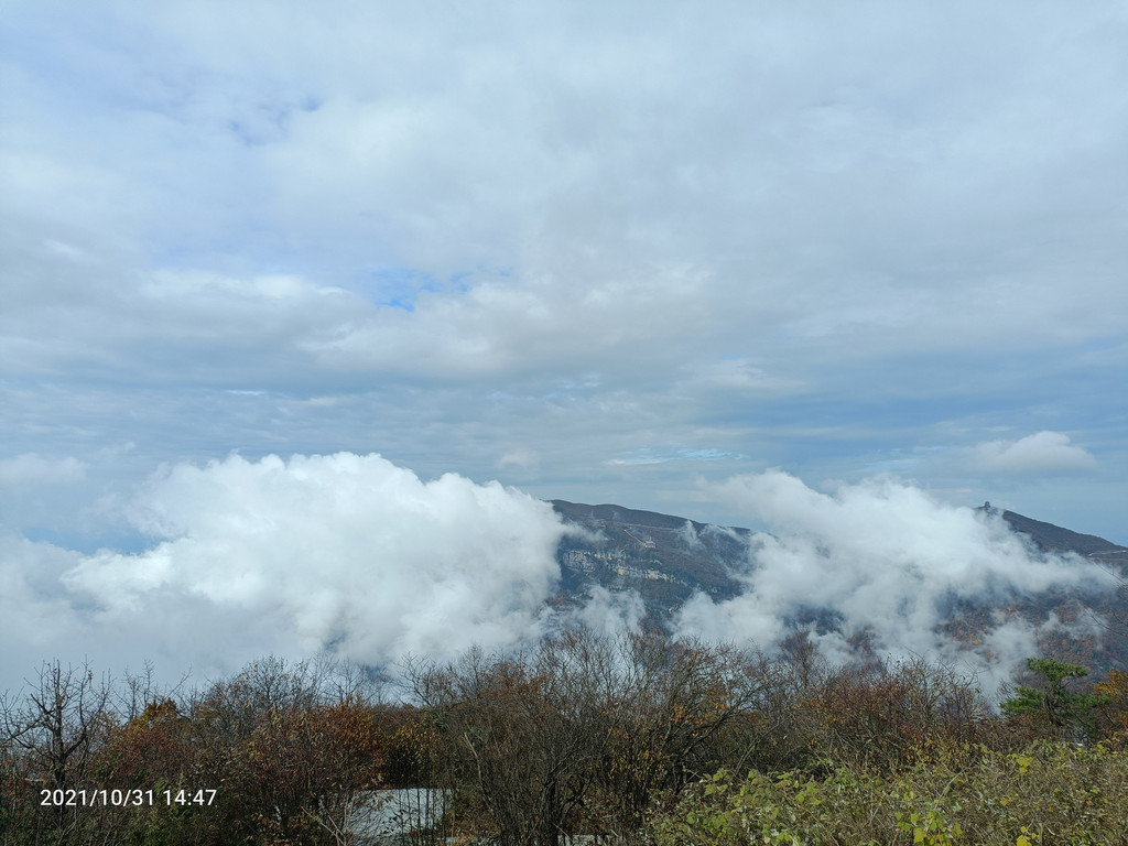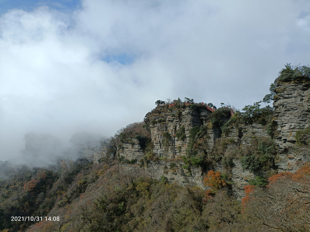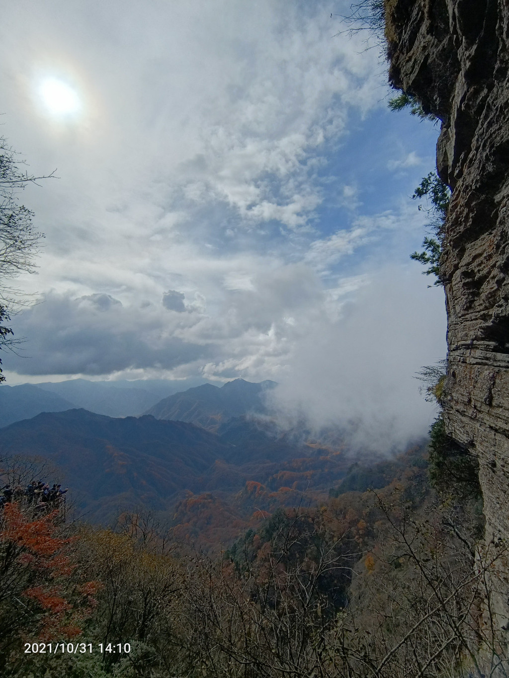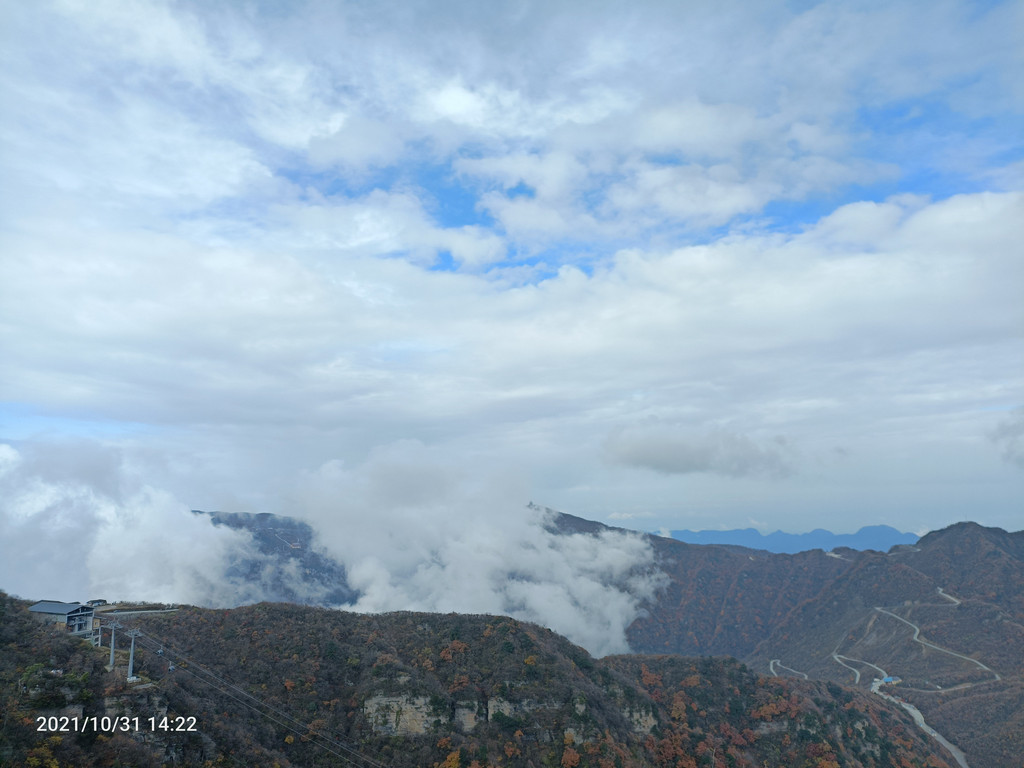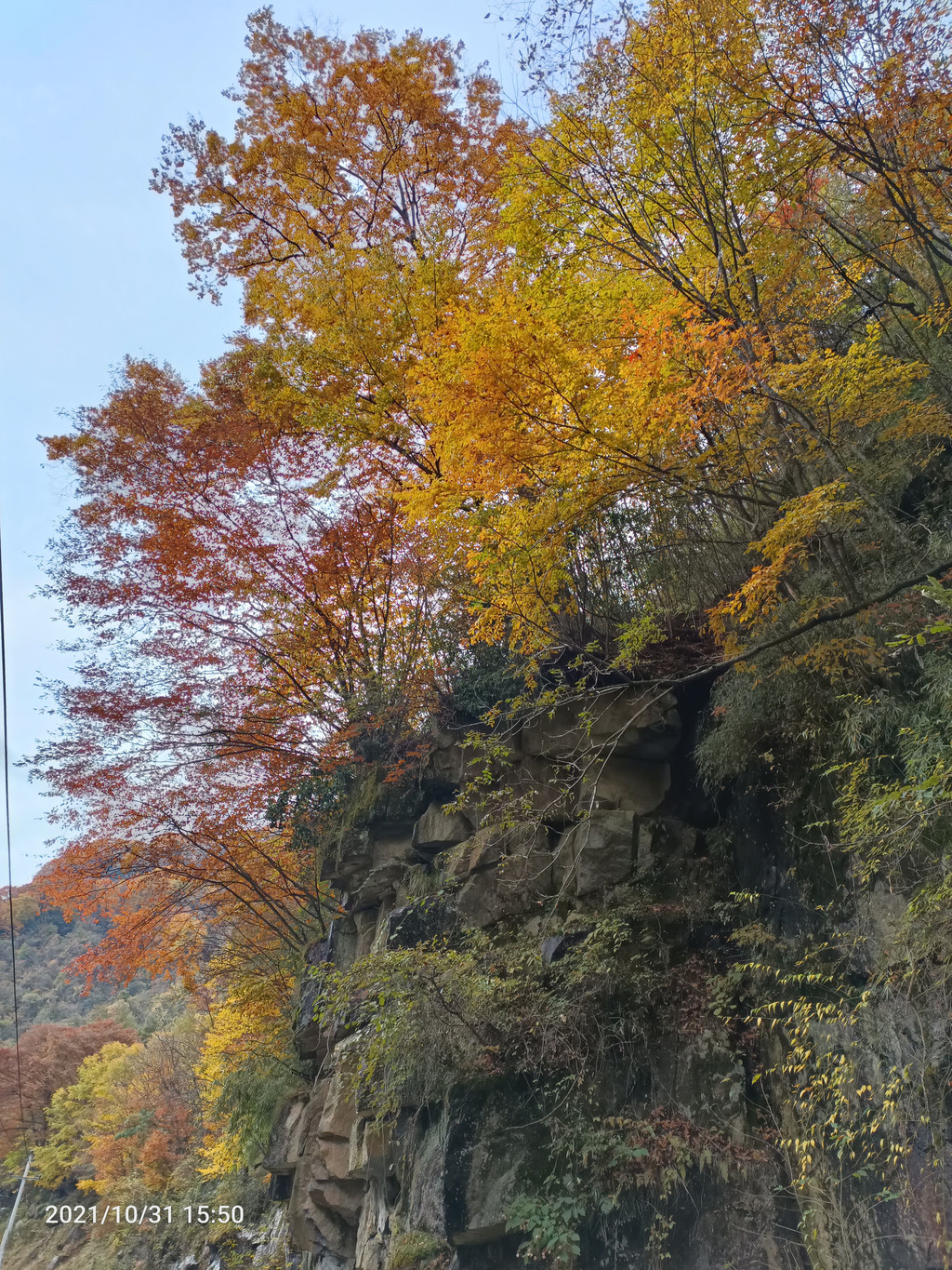 这是天然画廊到牟阳古城一路上的风景,虽然下雨,但是起雾山间又别是一番风景,只是我的手机像素有点渣,实际上看起来是非常壮观的,因为是大巴车,所以最前面有个位置,后面每次换乘我都是坐最前面去,视角真的非常好,如想拍摄一路上的风景最好是坐这个位置,当时看到这云雾缭绕的我非常想下车去拍,可是师傅不停(其实这个地方是可以停车下人的),所以只能车观一下了,我问师傅这是坐到哪里去,师傅说是拉到香炉山去坐索道,我心想索道不是自费吗,拉过去不坐的话那去香炉山干嘛呢,当时车上的人就在议论,所以在经过黑熊沟的时候师傅就停车了,说不去香炉山的就在此下车,我们就下来了,当时我确实不想去坐索道的,因为在之前了解红叶的时候是香炉山 上的最先红,我心想距离我来已过去许多天红叶估计都掉了,而且当时还是阴雨中,上去万一大雾什么都看不到,就作罢了先游览黑熊沟吧,也就是这一决定,后面就有悔了,因为到中午的时候就云开雾散出太阳了,想着来都来了,可不得坐索道在空中看一番漫山红遍,层林浸染的光雾山吗