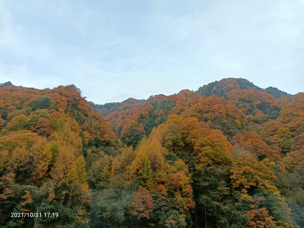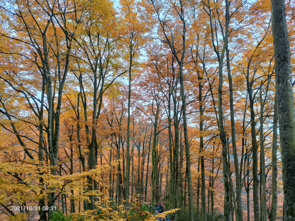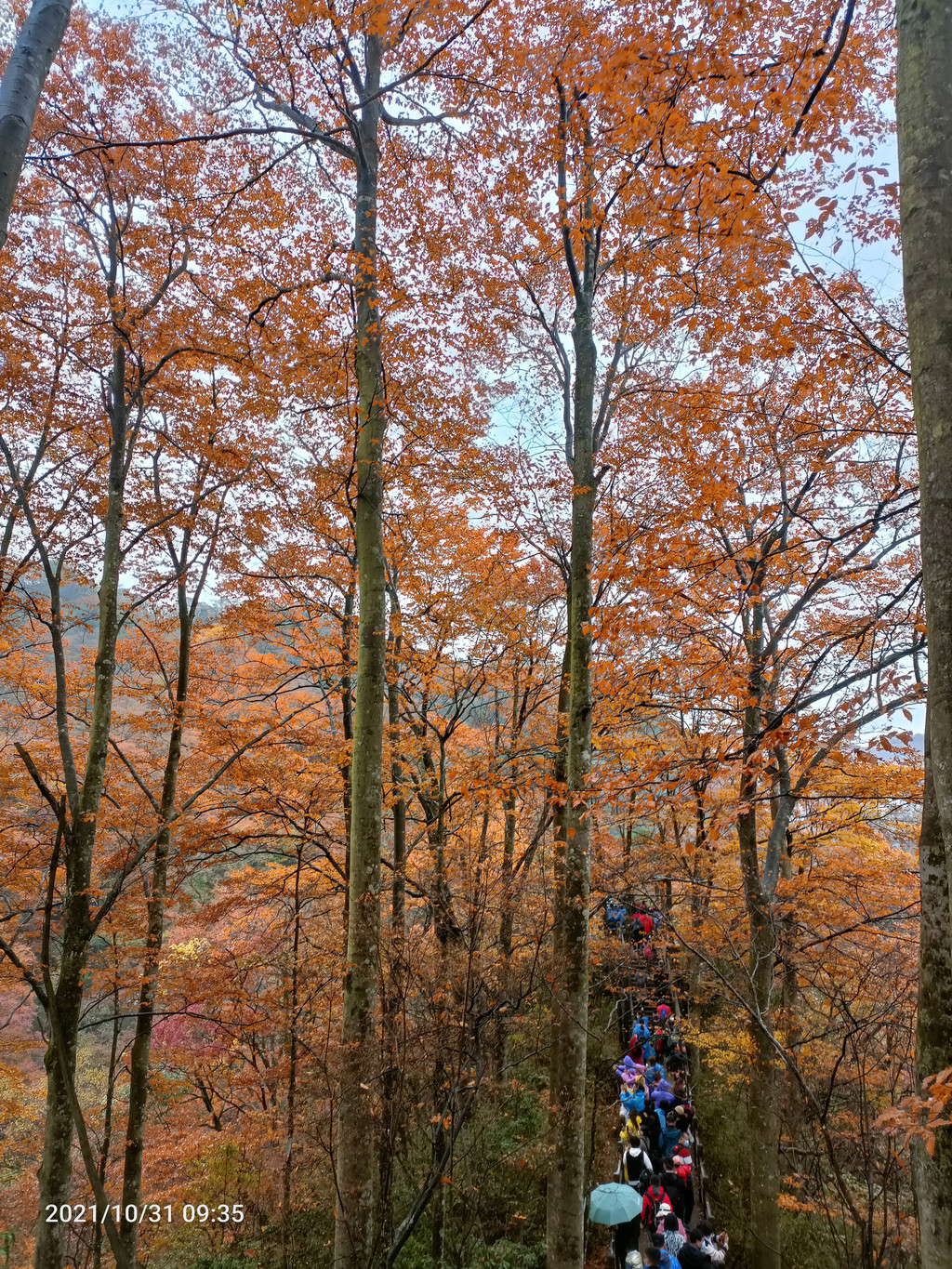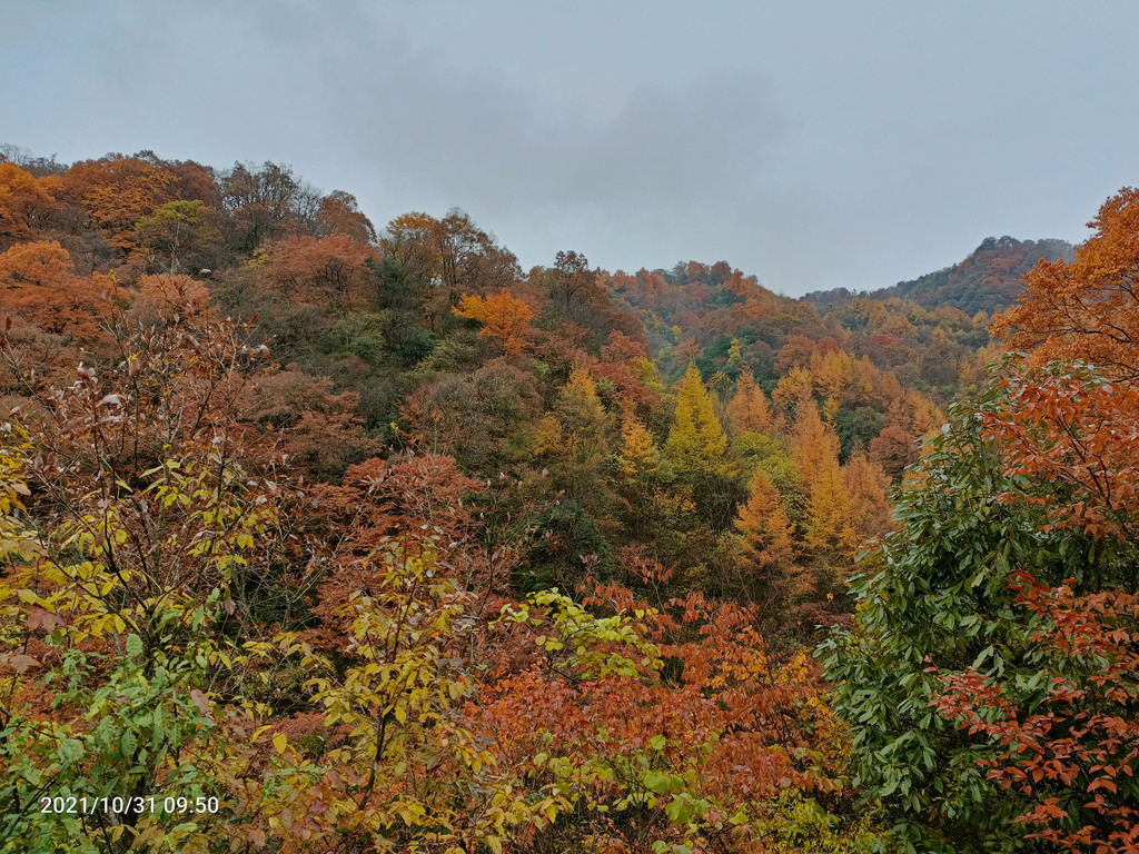 进入景区后,那可就是山路十八弯了,这雨也确实是小了很多,我就不停的看着窗外拍个不停,因为是我第一次看到这样大面积的秋色,玻璃一会儿又起雾我就不停的擦只为看那窗外不断变换的景色,第一个景点到的是天然画廊,下车的时候还在下小雨,但那看到美景雀跃的心下雨是足以忽略了,那成林的巴山水青冈可谓是美到极致了