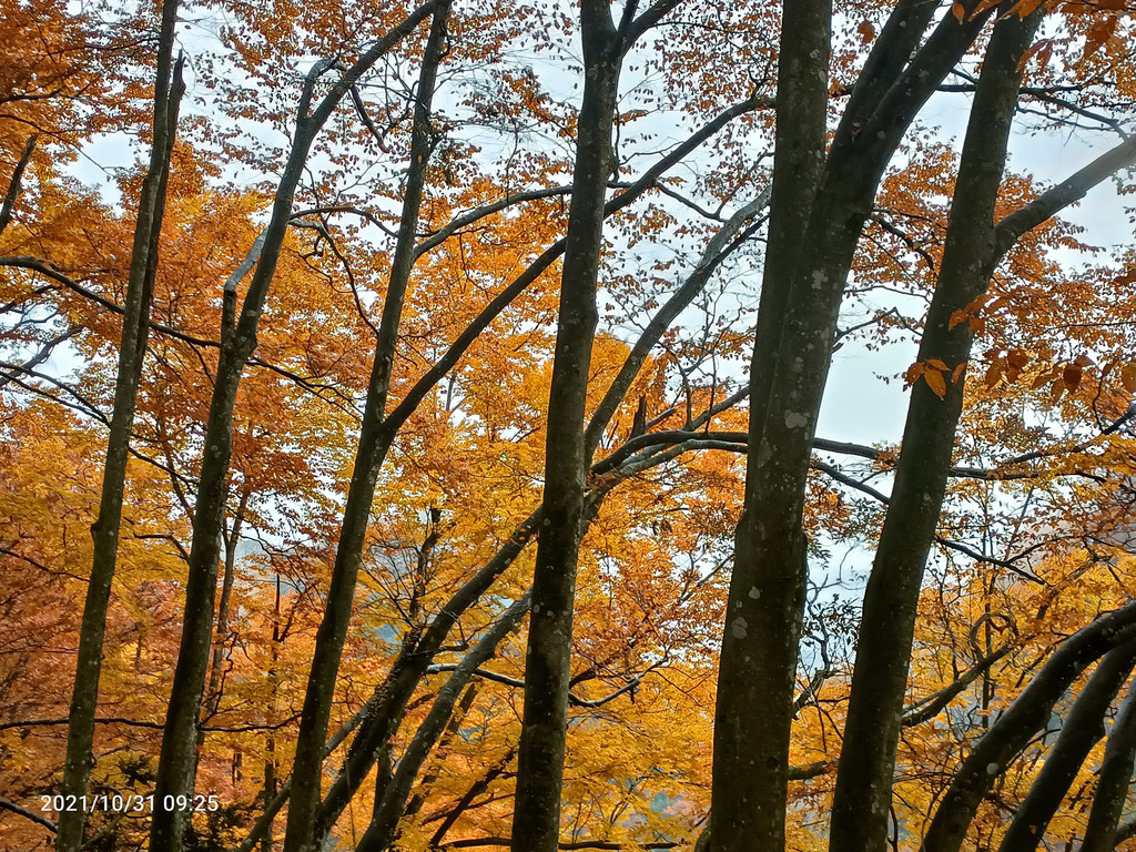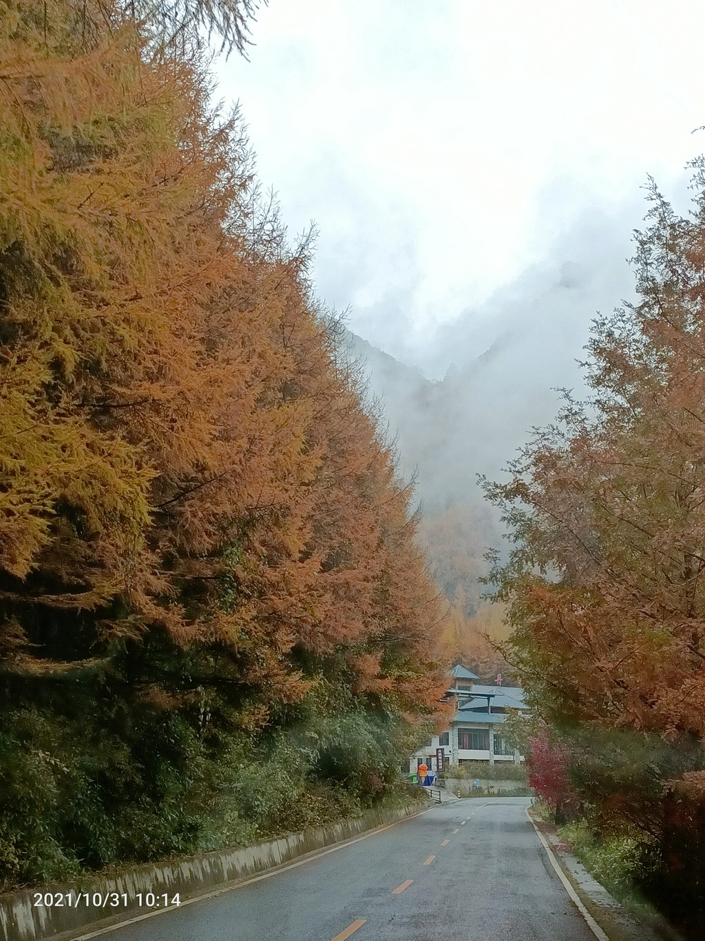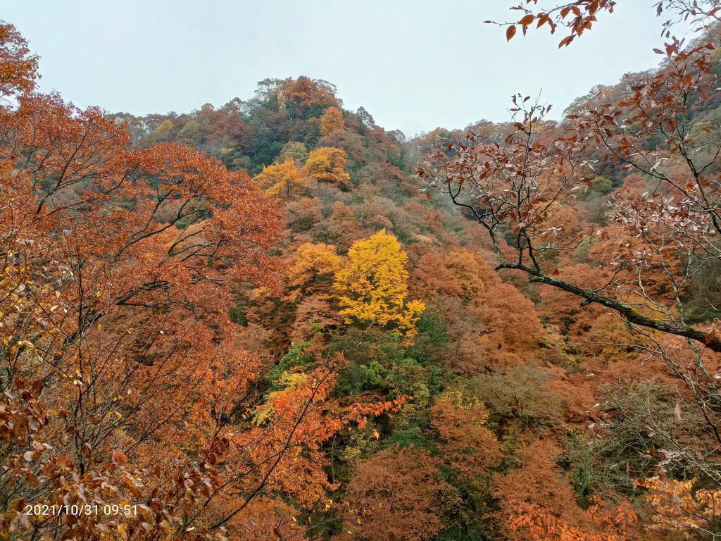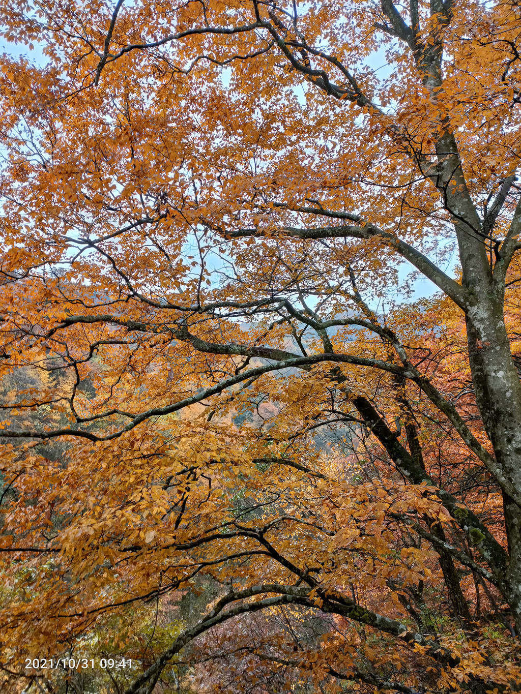 进入景区后,那可就是山路十八弯了,这雨也确实是小了很多,我就不停的看着窗外拍个不停,因为是我第一次看到这样大面积的秋色,玻璃一会儿又起雾我就不停的擦只为看那窗外不断变换的景色,第一个景点到的是天然画廊,下车的时候还在下小雨,但那看到美景雀跃的心下雨是足以忽略了,那成林的巴山水青冈可谓是美到极致了
