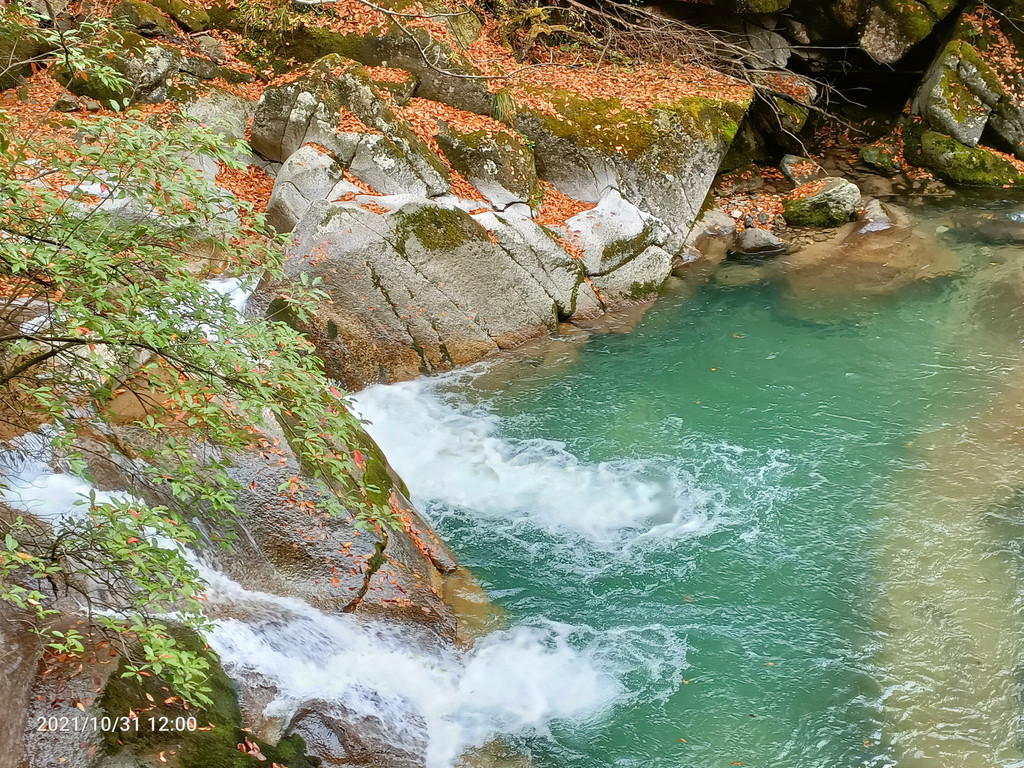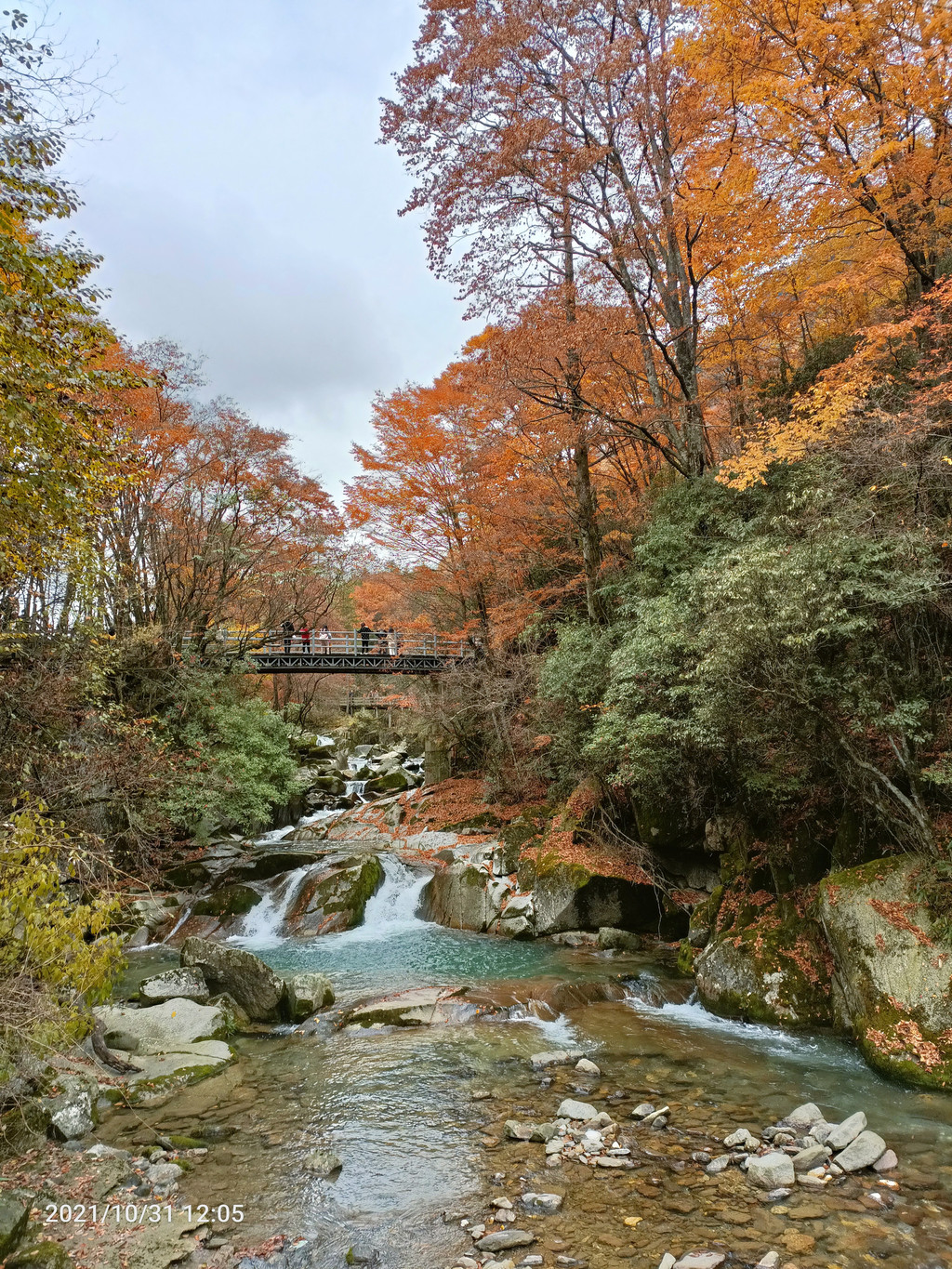 这就是走到黑熊沟精华段看到的第一眼景致,这才对呀,无论是我在视频还是照片里面看到的黑熊沟是这样的才对呀,于是又是兴致大发,一个黑熊沟玩到一半,我的手机电就没了,可想而知我是拍了多少,本身我也是带了充电宝的可是下车进景区的时候忘带了,只好在景区马上租了一个充电宝给手机续命,要是我手机因为没电拍不了照那是万万不能接受的,如果说见到天然画廊是爱上光雾山的第一面,那么见到真正的黑熊沟那是爱上光雾山的灵魂了,山溪配红叶,多么的绝配呀,正因为这水给这景致注入了灵魂,流水潺潺多么悦耳啊