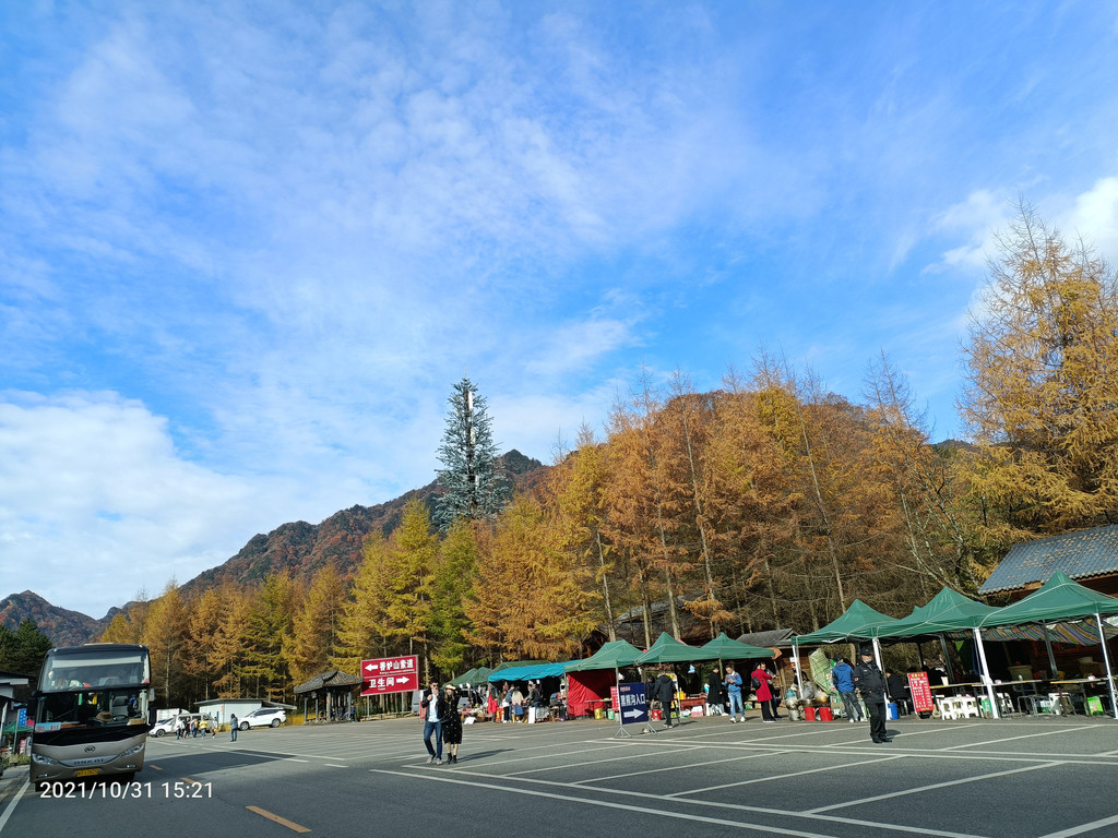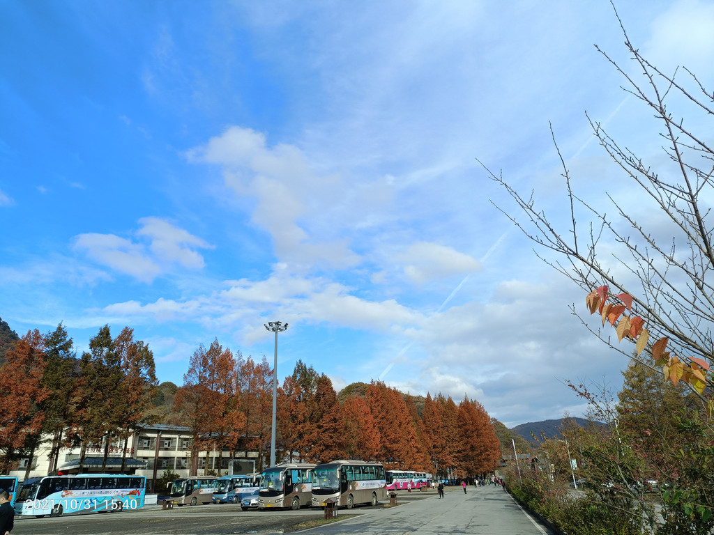 吃完早饭就奔景区大门去了,虽天气不好,但还是有挺多人的,停车场停了很多车,进停车场要先给钱,20块钱一停,也不限时,车停好后就进景区,要看健康码以及行程码,门票网上预定的也只是看一眼就进去了,在门票管理这块不严,进去后里面全是大巴车,也就是所谓的观光车吧,估计也就是红叶期间过来运营的车吧,平时是可以自驾进景区的