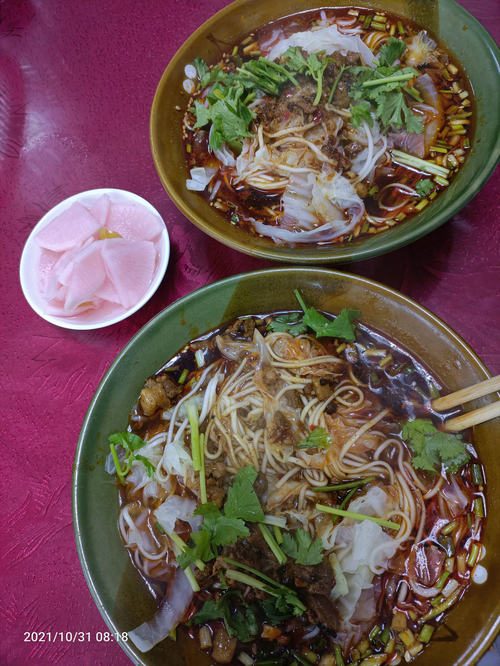 第二天一早闹钟准时响起,想着要去玩,一点床没赖就起来了,因为带了古装穿衣服倒简单,就是弄头发被难倒了,我家那位连编辫子都不行,一大早也是气煞我也,只好自己随便弄弄,摸来摸去出门也是八点多了,结果一出门发现在下雨,出行时看天气预报是星期六晴天,星期天阴天,怎么还下起雨来了,大老远跑过来只能看一个景区罢了还下雨,欲哭无泪,开在去景区的路上雨还越下越大,真是把热情都浇灭了,快到景区时看到两边都是吃饭住宿的门面心想还是下去吃个早饭,在吃的空当听老板娘谈起天气说昨天也是这样,早上下大雨,中午就晴了,我赶忙问那今天你看还会不会晴呢,她说会,我当时好像听到一个天大好消息似的,心情都好起来了,这是在她家吃的小米米线,手艺跟我四川老家很像