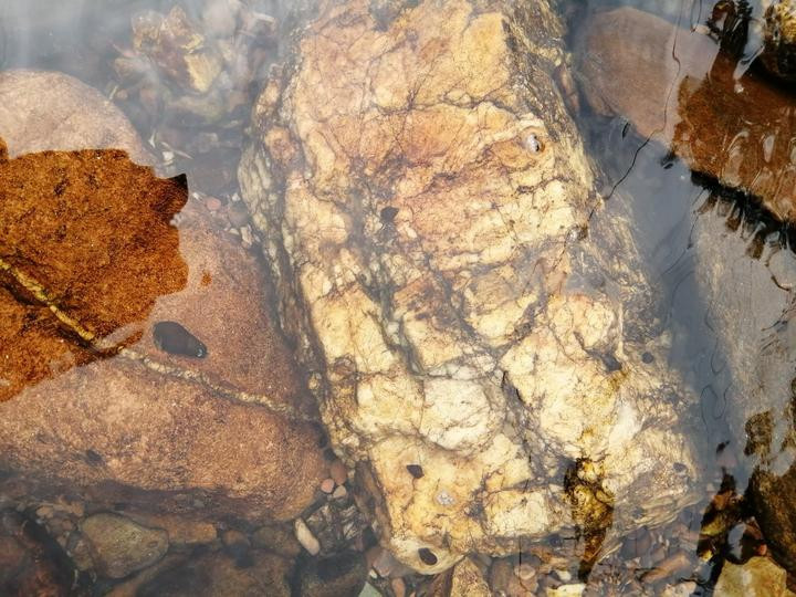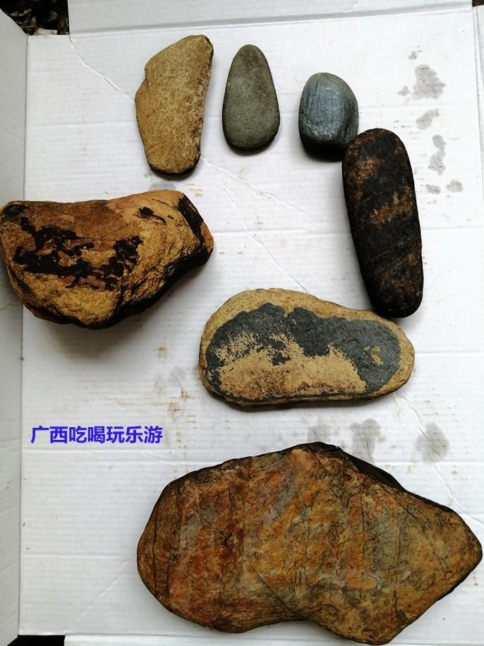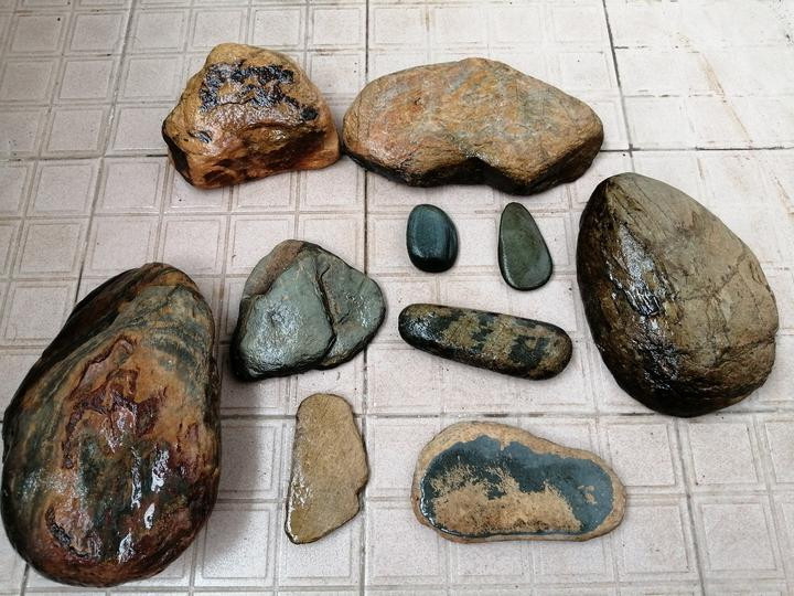 于是我们忍不住捡了起来,大家不时发现漂亮的石头,捡得不亦乐乎。看看我的成果,有像龙的,有中间有个“雄”字的,有两个人在聊天的,有泛着金色纹路的。 大家觉得那一块最好、最有收藏价值呢?