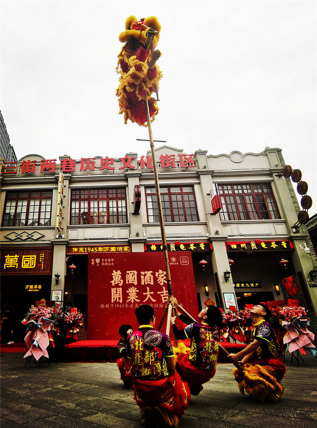 南宁传统的舞狮表演与三街两巷万国酒家共同呈现出传统特色文化,相得益彰。