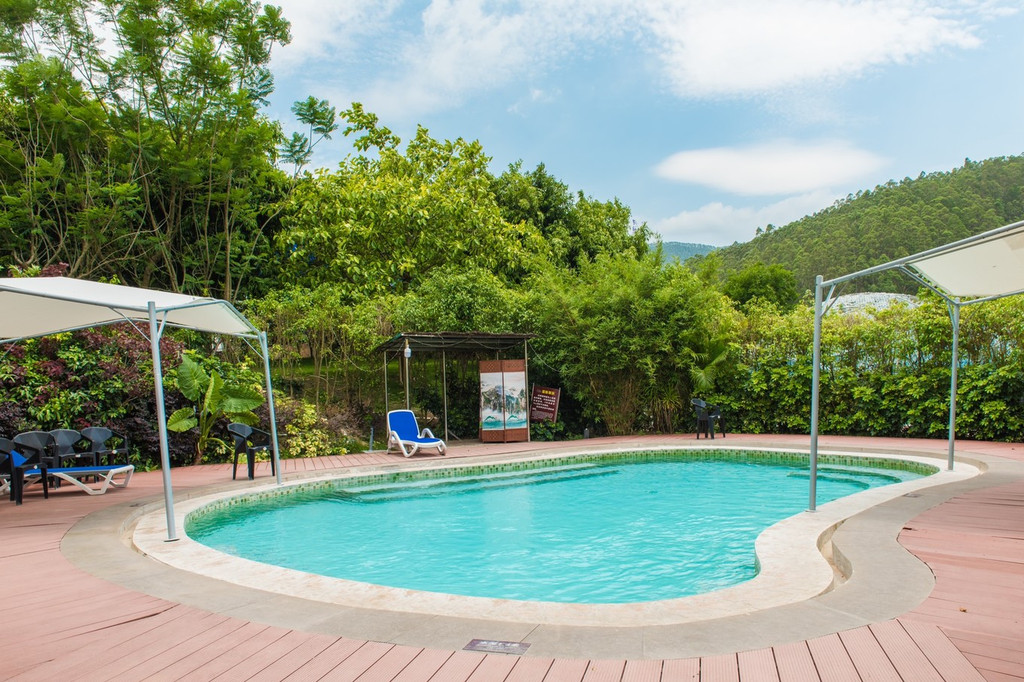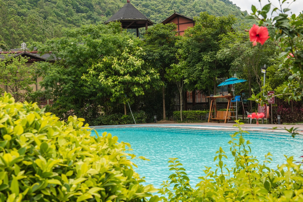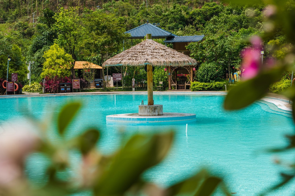 温泉与泳池之间错落有致,一条溪水蜿蜒而过,形成小桥流水亭台楼阁的雅致景观,别有诗情画意,整个设计布局独具匠心,与自然环境和谐融合,赏心悦目,美不胜收,不论是情侣,朋友,亲子还是老人都很适合来到这里休闲养生。