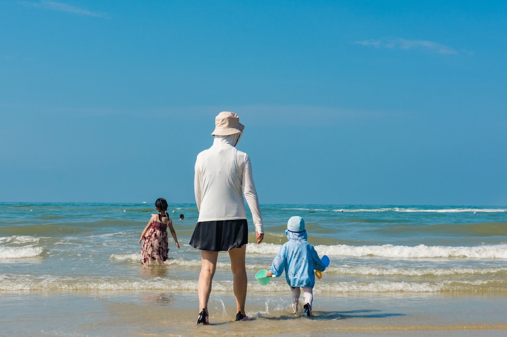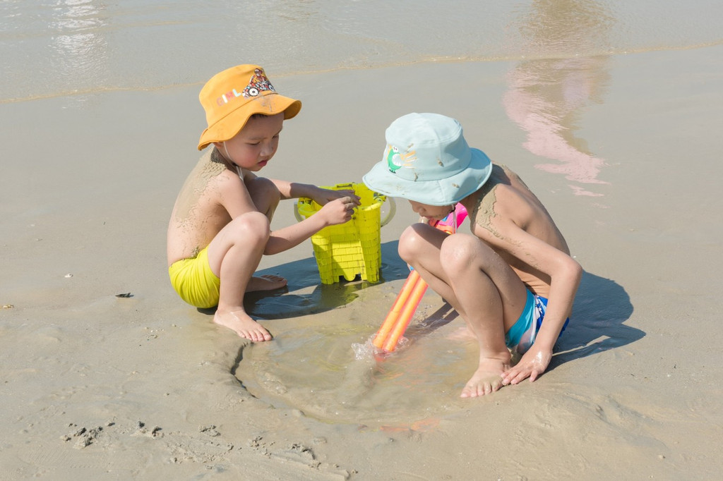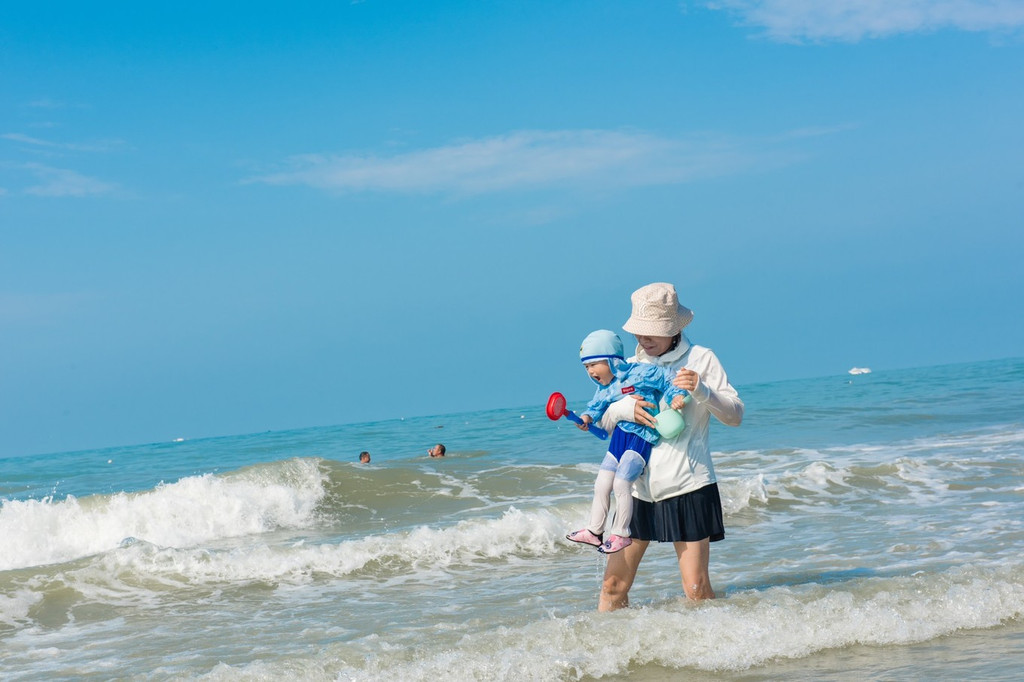 北海银滩浴场宽阔,海水退潮快,涨潮慢,沙滩自净能力强,游泳安全系数高,海水透明度大于2米,超过我国沿海海水平均标准的一倍上,年平均水温23.7℃。小朋友们在欢乐的玩沙玩水,很好的与大海融合,也不亦乐乎。