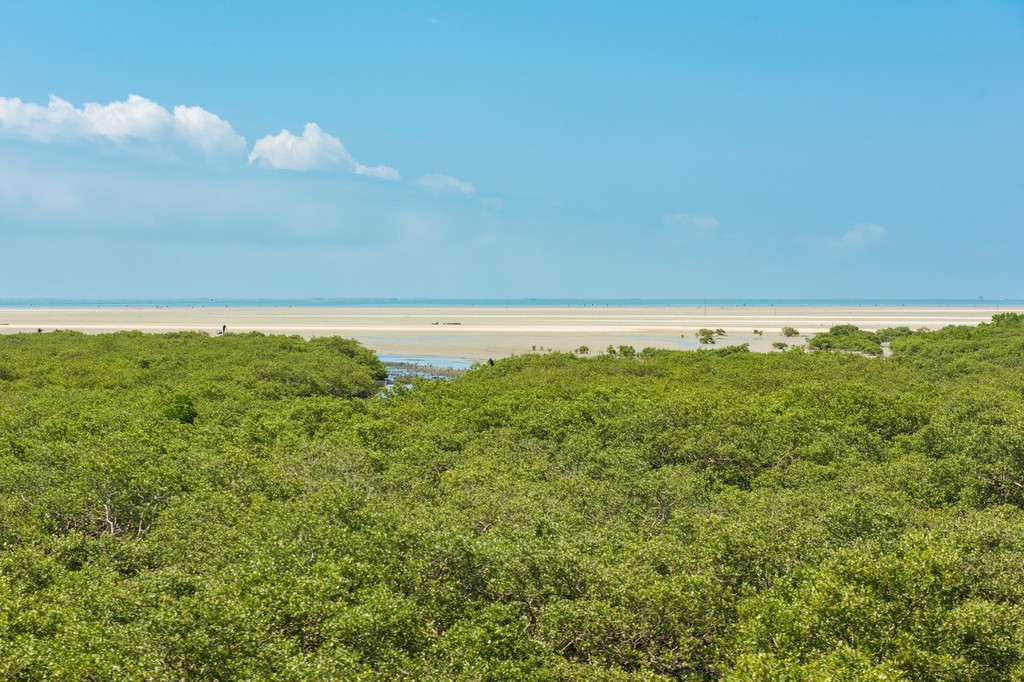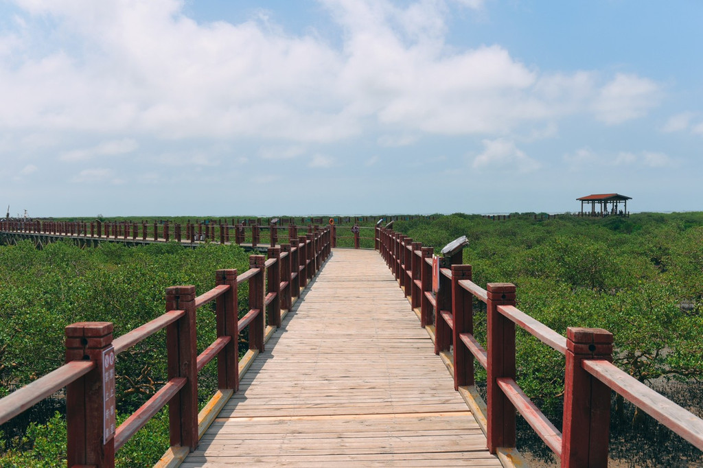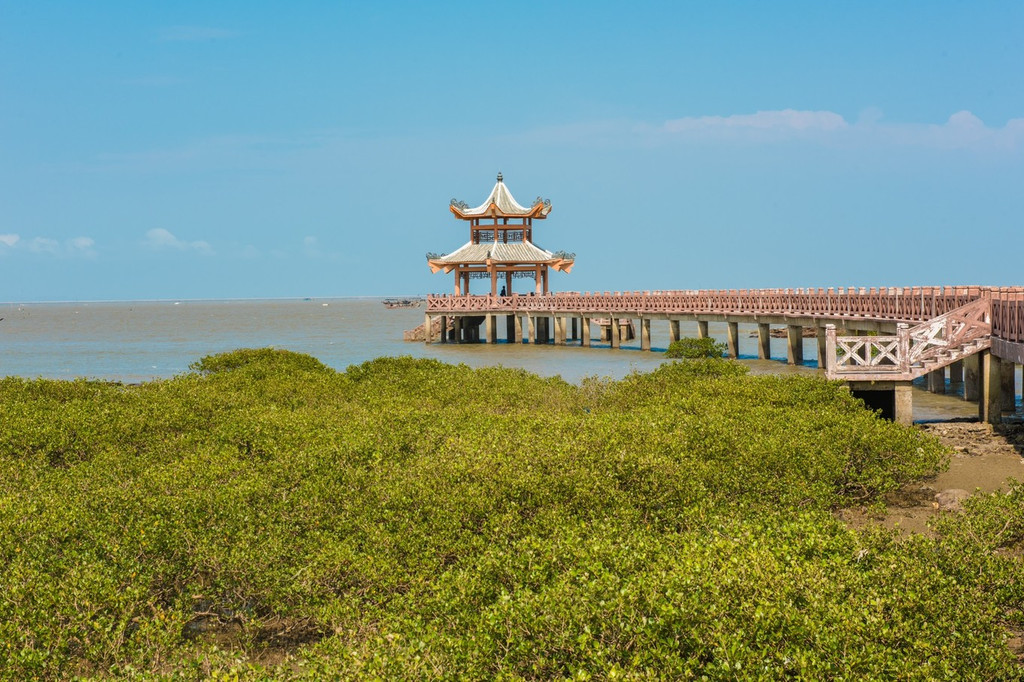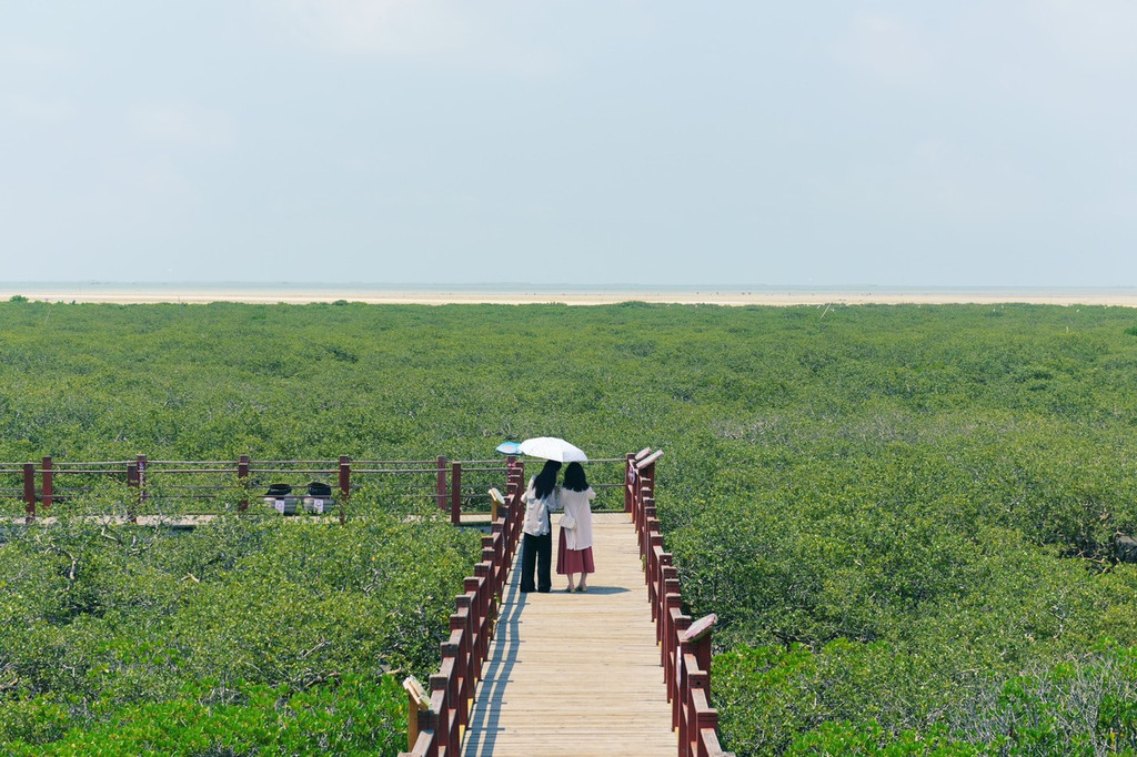 红树林景区属于滨海湿地,种植了大面积沙地红树林,每到涨潮时树就淹没在水底,直到退潮才露出,边上的沙滩还可以拾贝捉蟹,赶海极具乐趣。