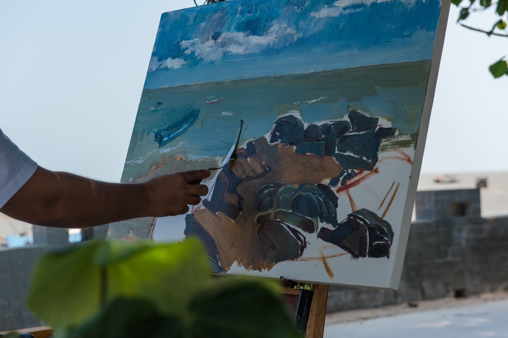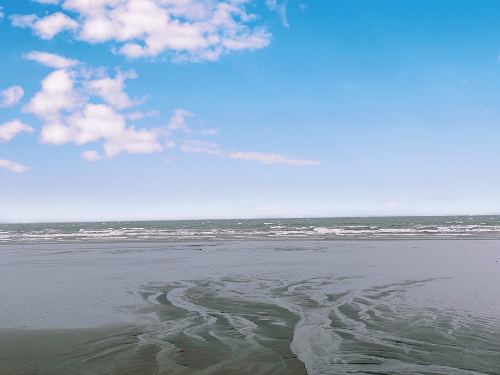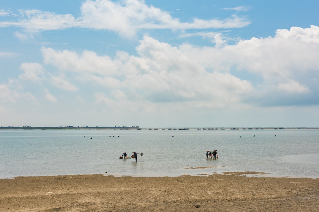 金滩因为坡缓、滩平、无淤泥,浅滩渔产丰富,是全国最适宜拉大网捕捞的地方。海天一色,如一副美丽的油画~