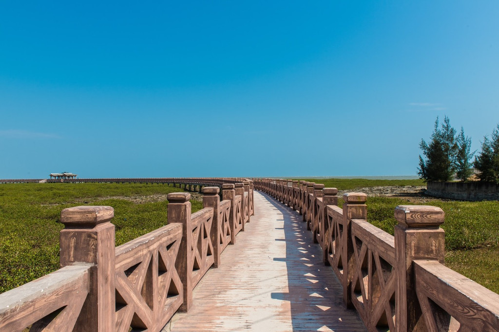 沿着栈道慢慢向前,蔚蓝色的天空,海风轻轻的吹拂,一眼望去,无边无际, 水里 还种植了大片红树林。
