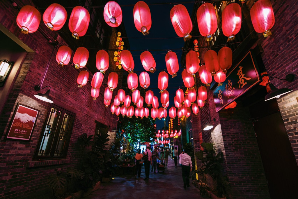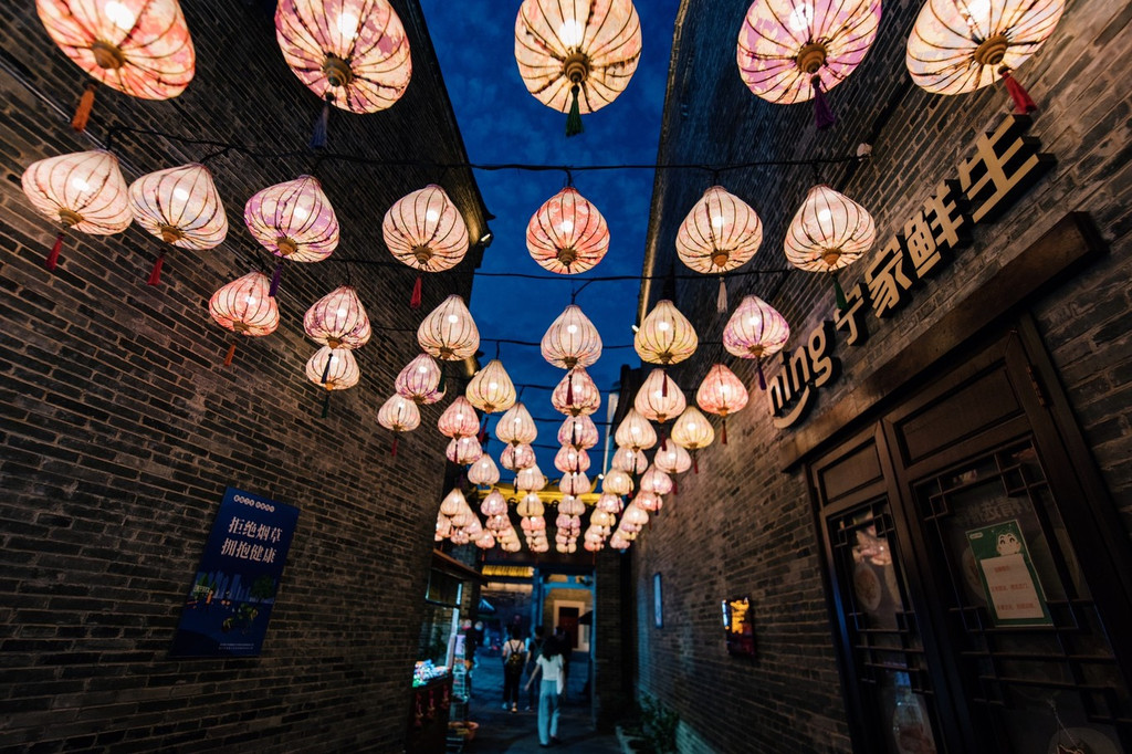 大街小巷的灯笼高高挂,红光四射,喜气洋洋的光照射在石墙上,随风摇曳,静静看着,竟有种旧时光凝滞的感觉,艳丽夺目,华而不俗。