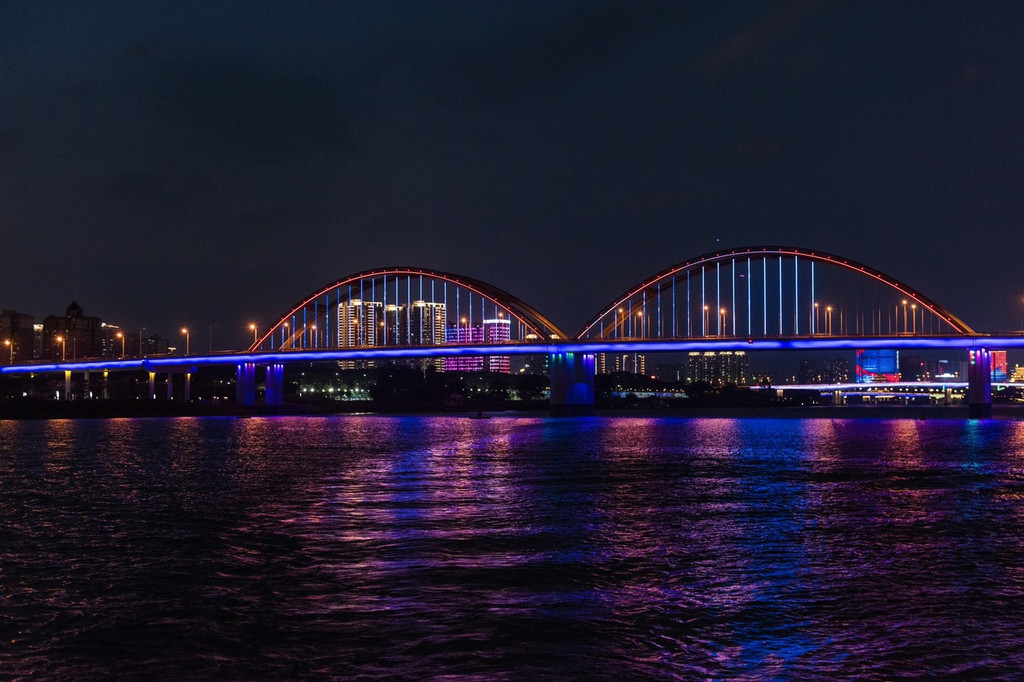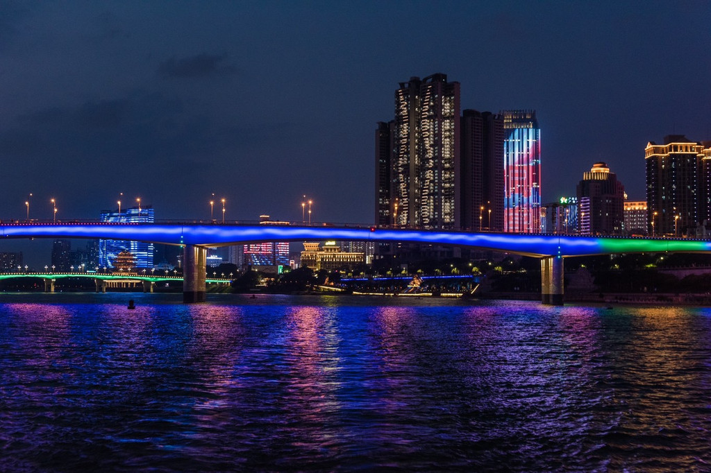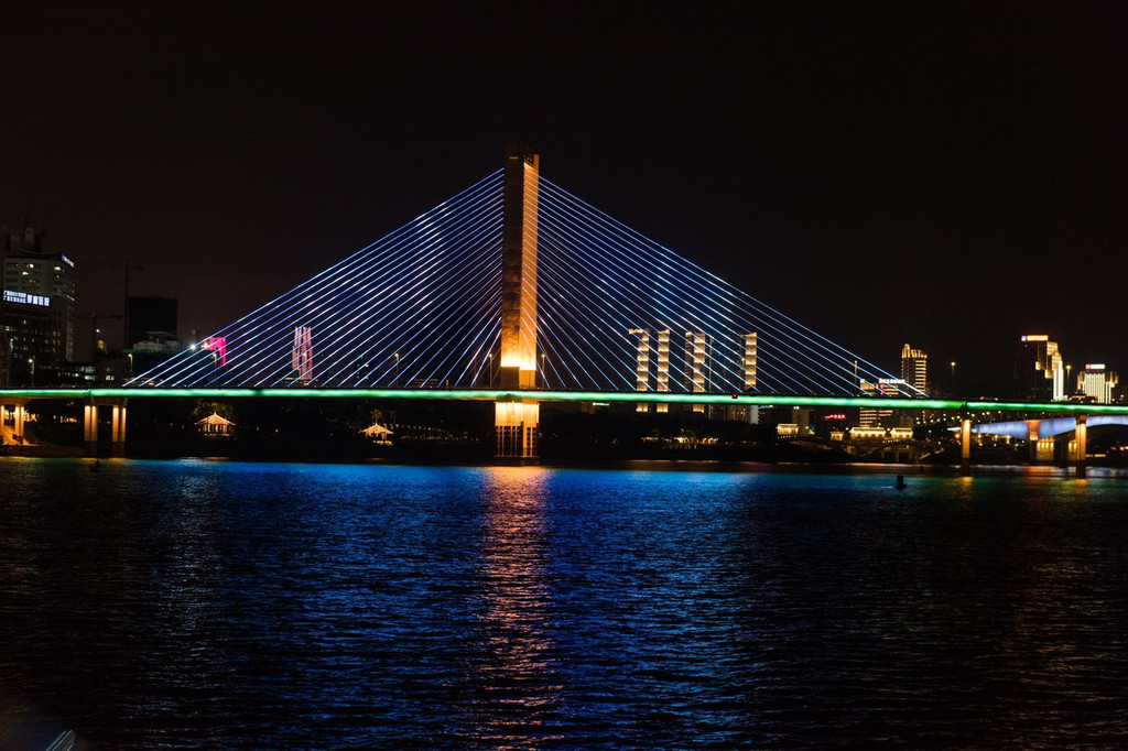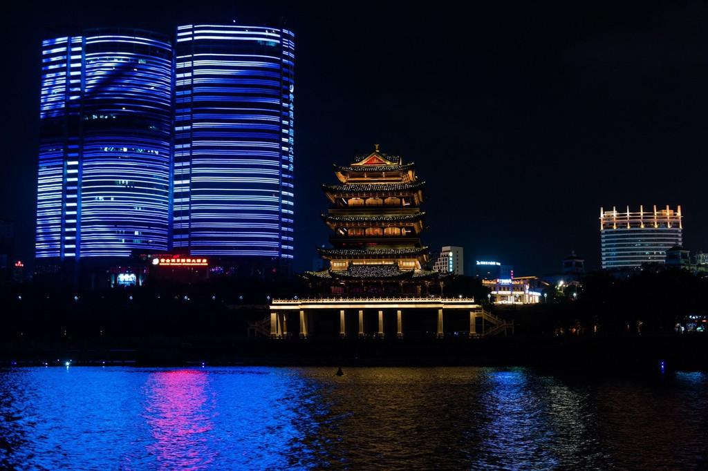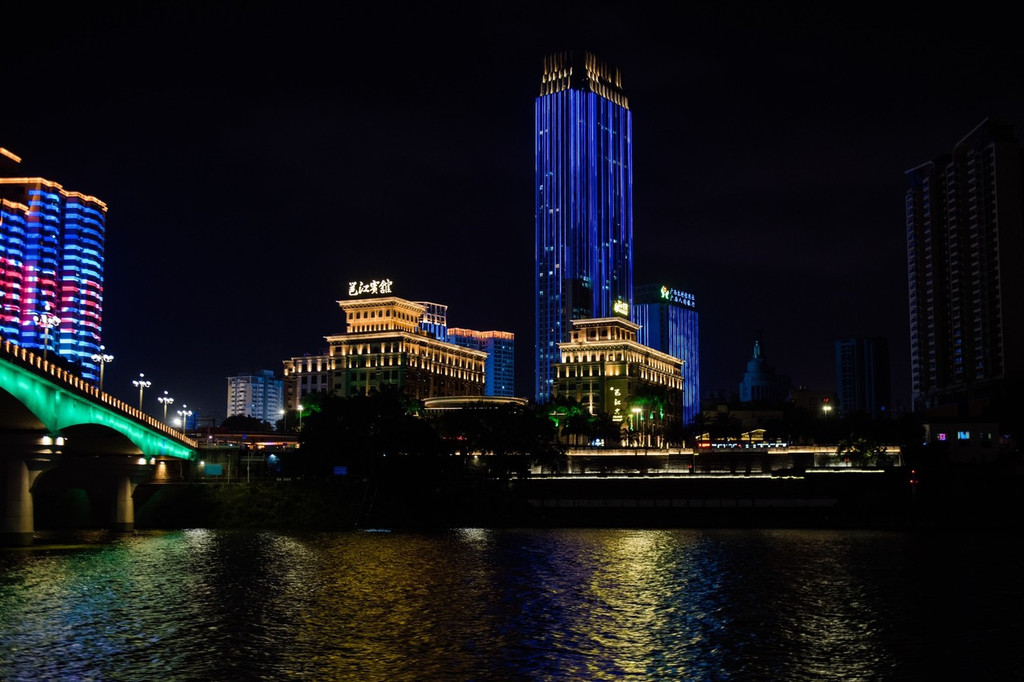 邕江两岸仿佛被笼罩在梦境中,有一种朦胧之美,让整个夜晚都变的浪漫起来。江边的高楼耸立,五彩斑斓,变幻无穷,江畔被重重的光影包围,十分壮观。