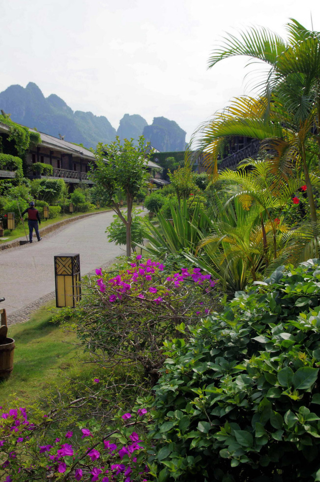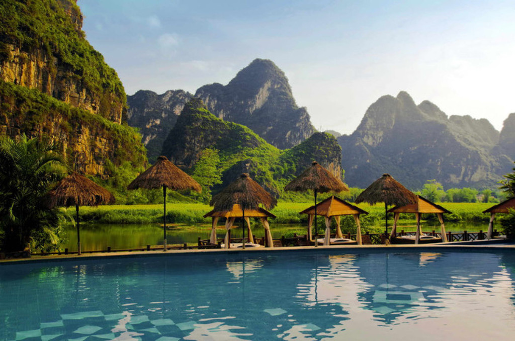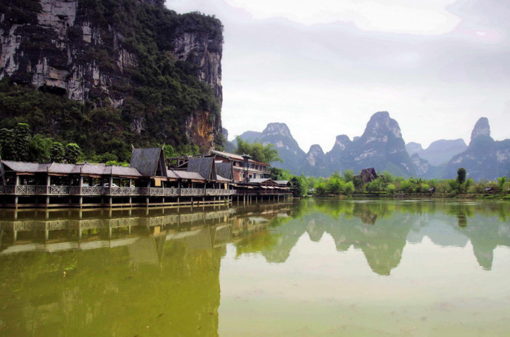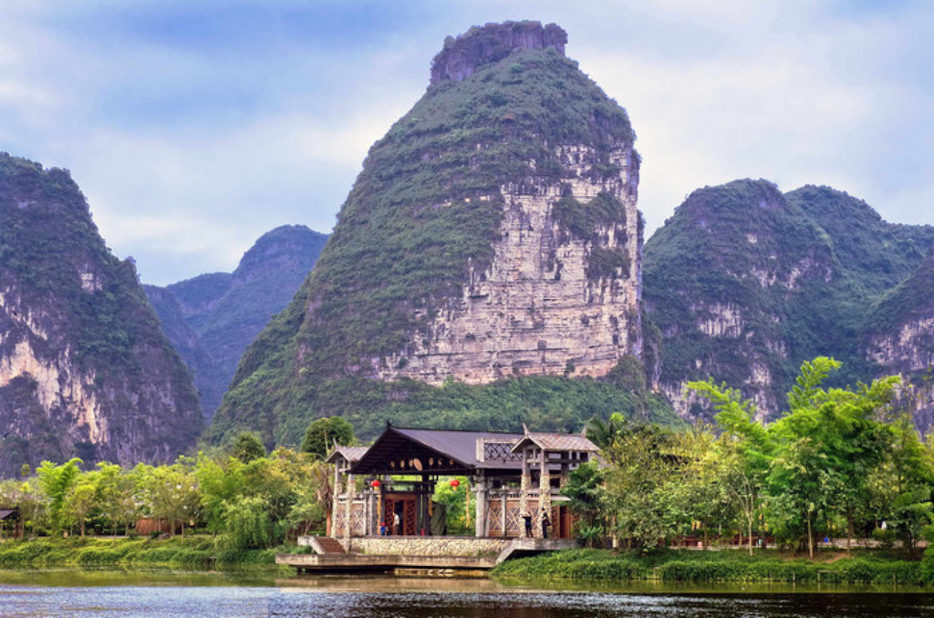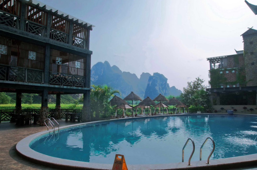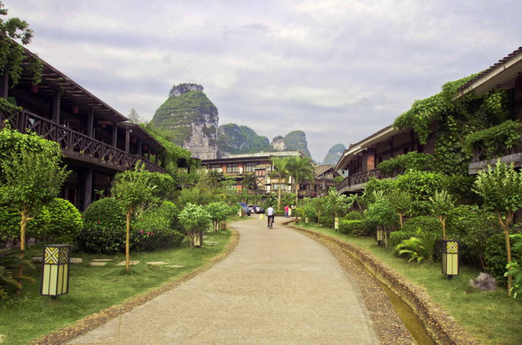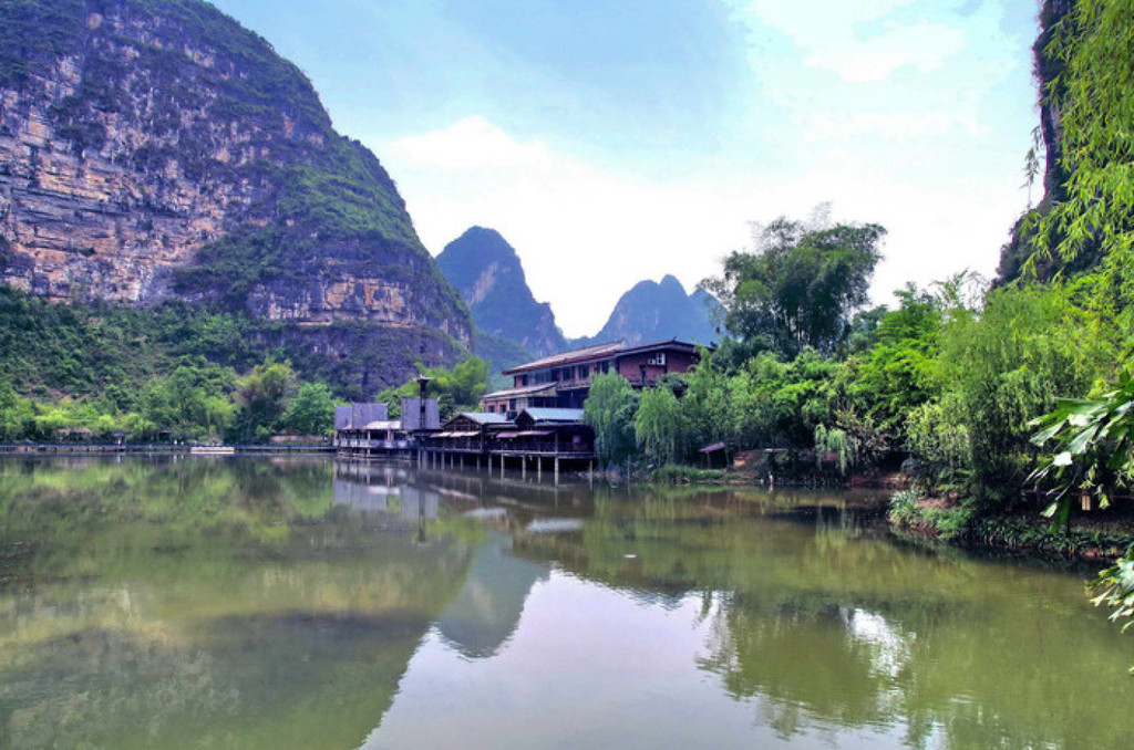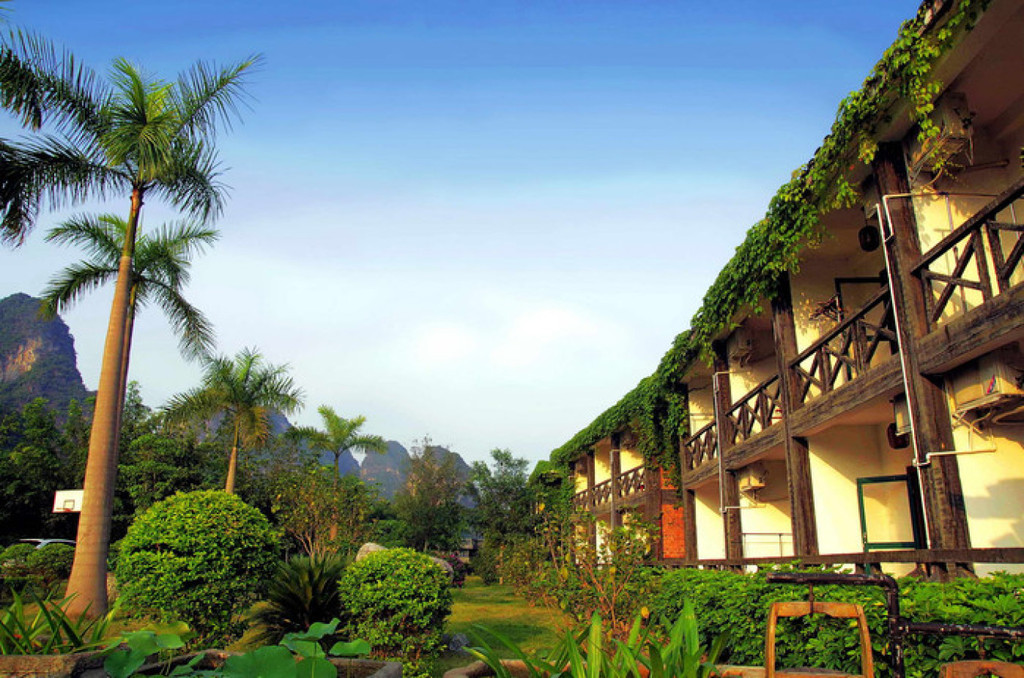 明仕山庄于风光如画的明仕河边,酒店装修融入壮族民族特色,。壮族民居特色的建筑点缀在清淡雅的山水之间,