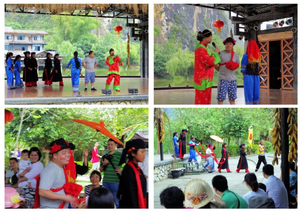 还请游客上台扮演新郎,演出诙谐幽默的娶媳妇节目。