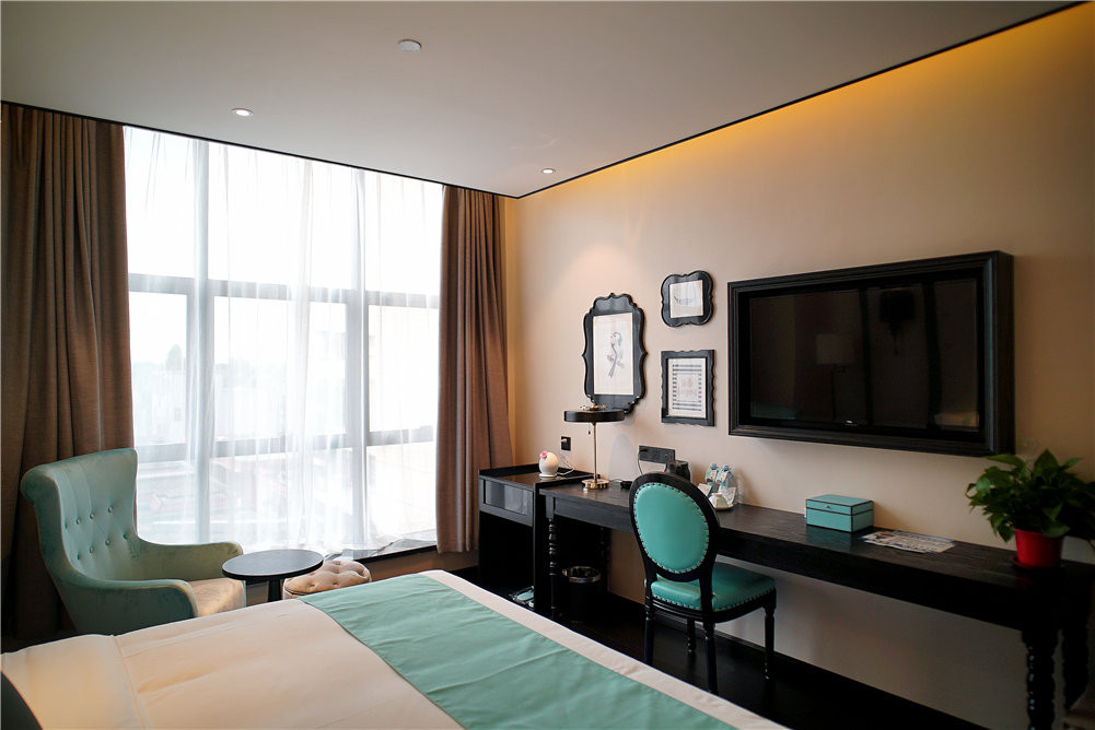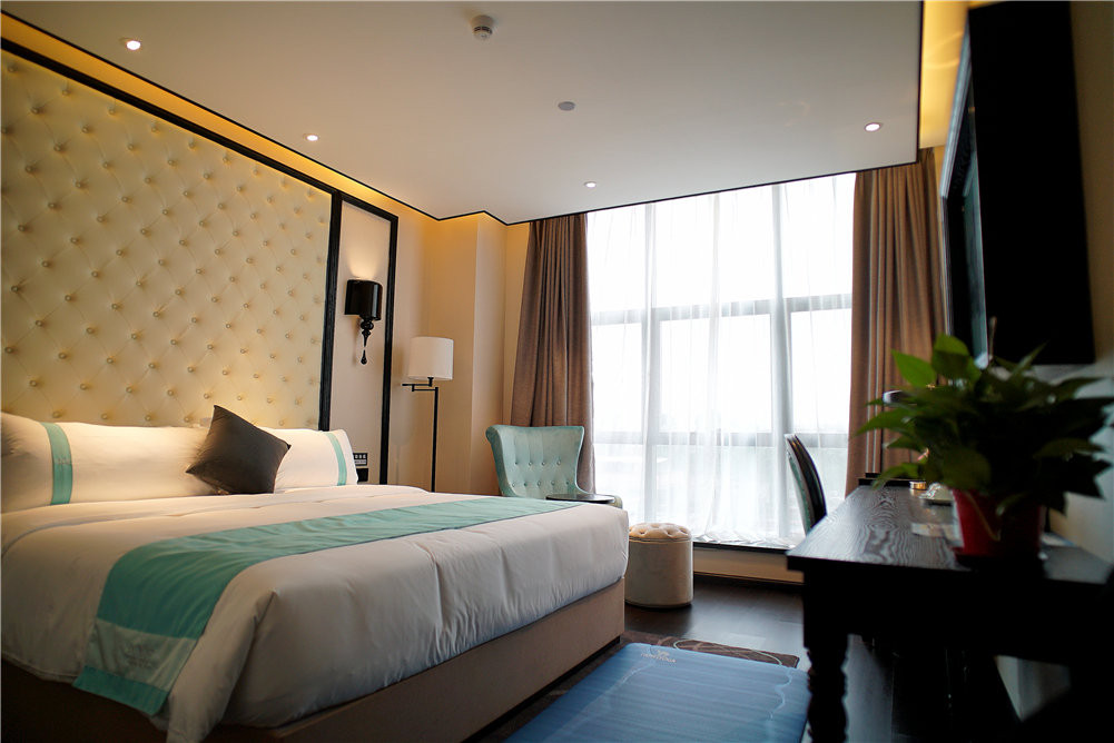 酒店周边很安静,一觉睡到自然醒,智能化控制系统开关打开落地窗帘,天已大亮。仔细看看客房,温馨精致。20平米左右的睡房空间显得宽敞大气。2米宽的特大床厚实柔软顺滑,感觉专门为女神准备滴一样。睡床总体色系和客房格调也很搭,是女生喜欢的。