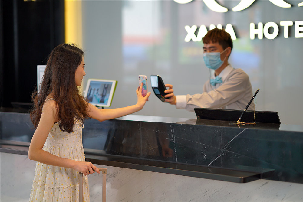 整个办理入住的过程不到3分钟,还包含了测体温、提供健康绿码。前台有免费的消毒清洗液,酒店员工全称佩戴口罩,让客人安心入住。
