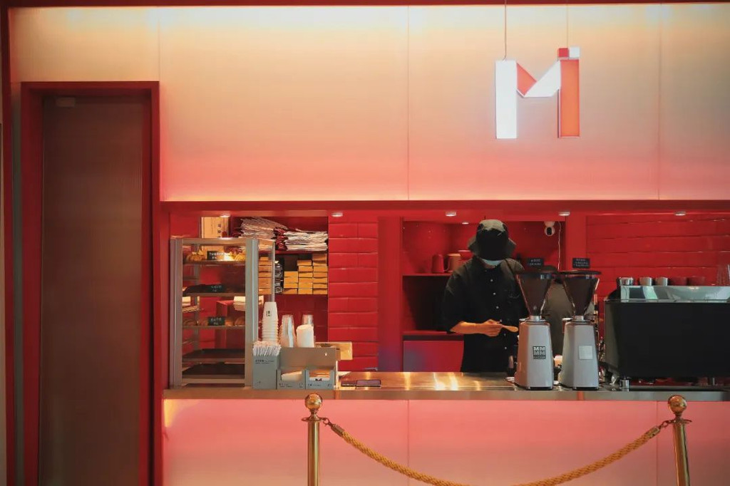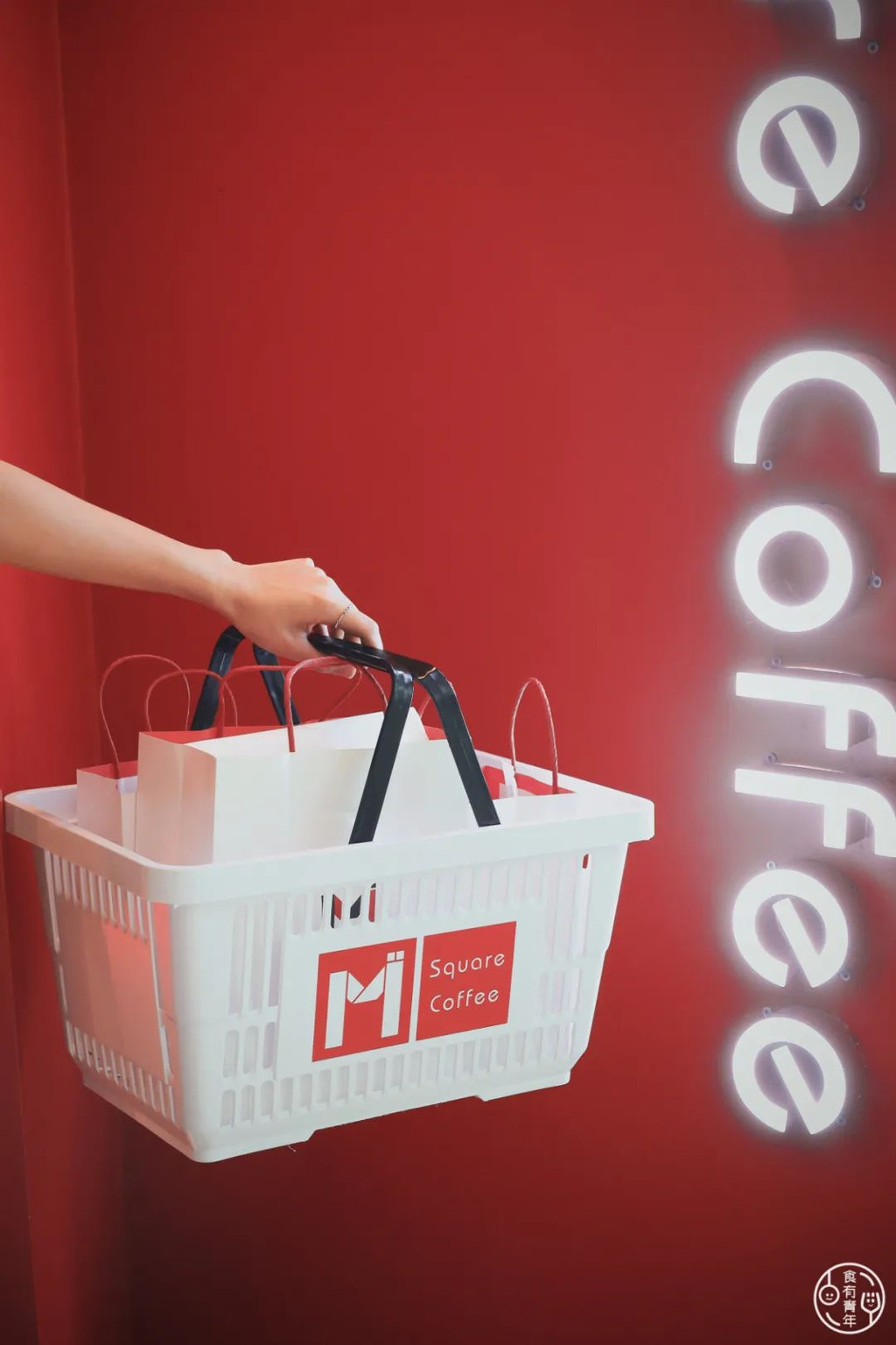 侨鑫国际二楼新开携带大M字红色咖啡,站在地面广场就能远远看到。原来是做广场移动咖啡小立方体,M字加["]正是建筑面积单位m2,店名Square是平方也是正方。