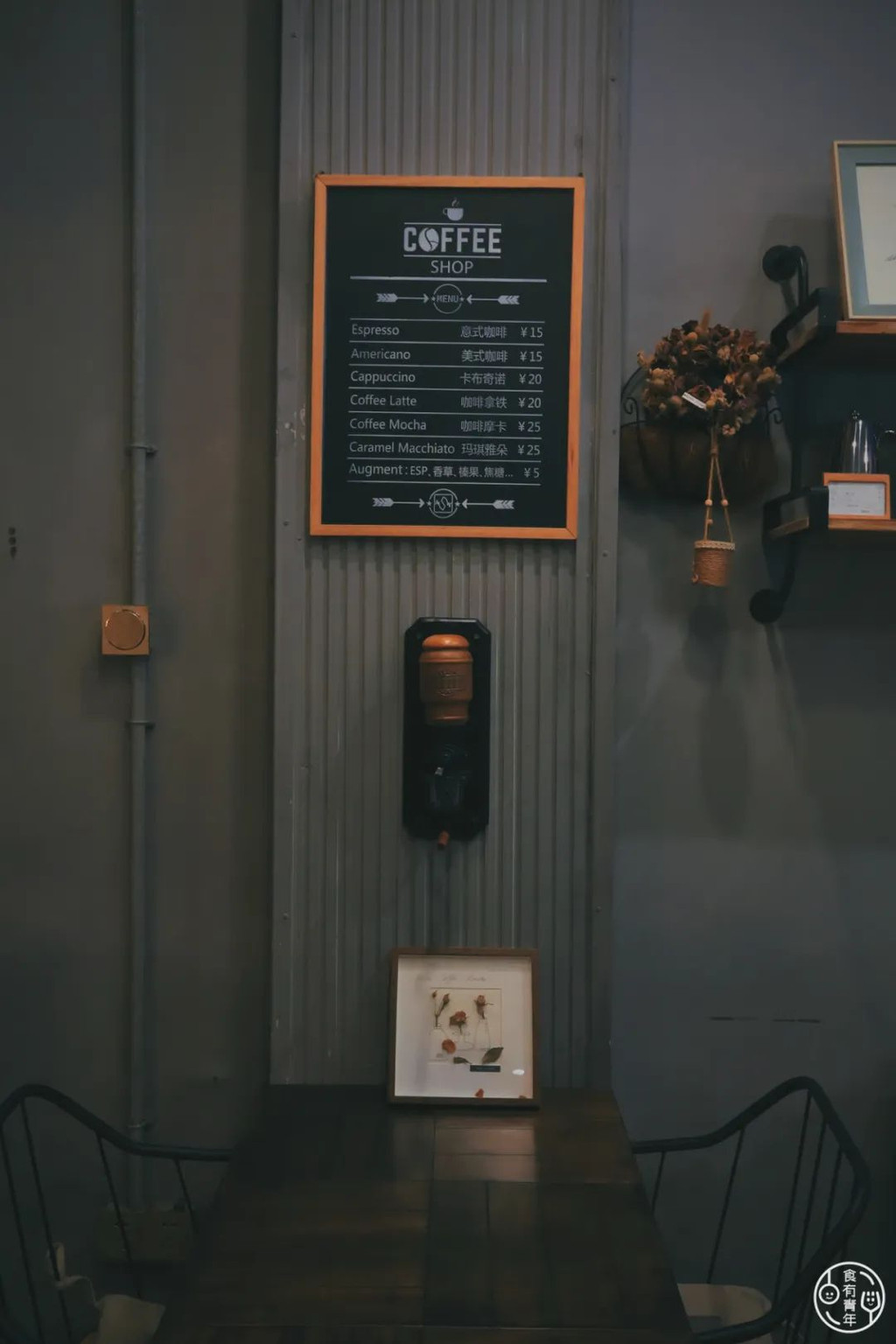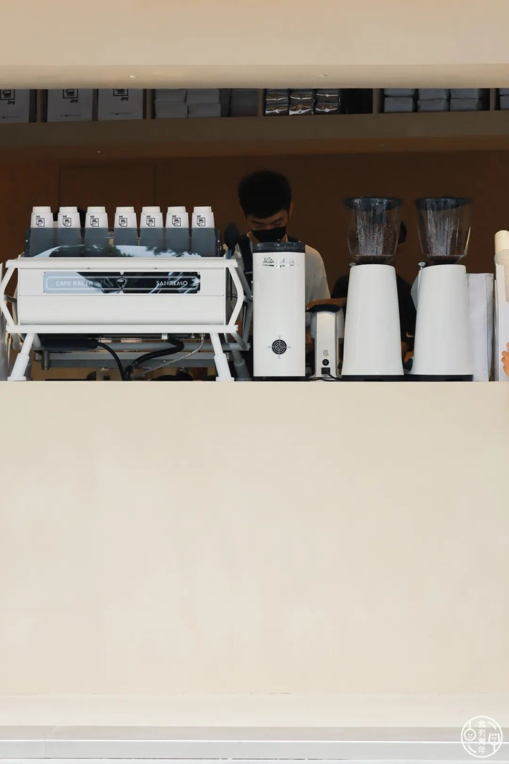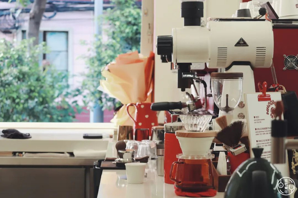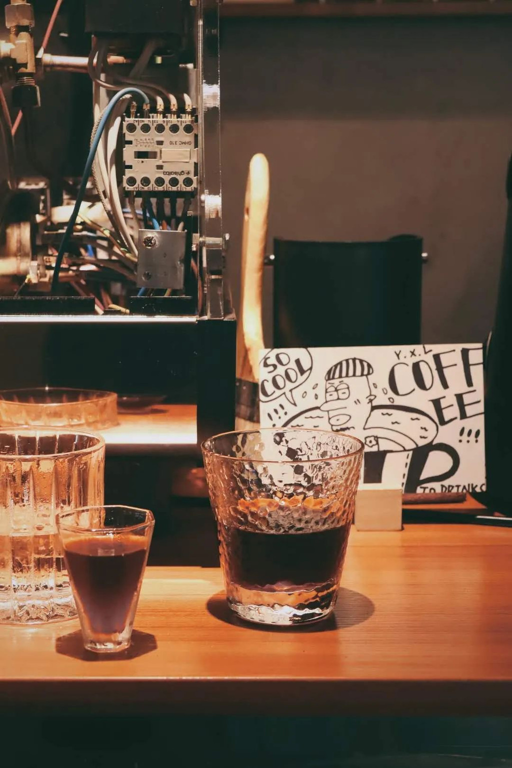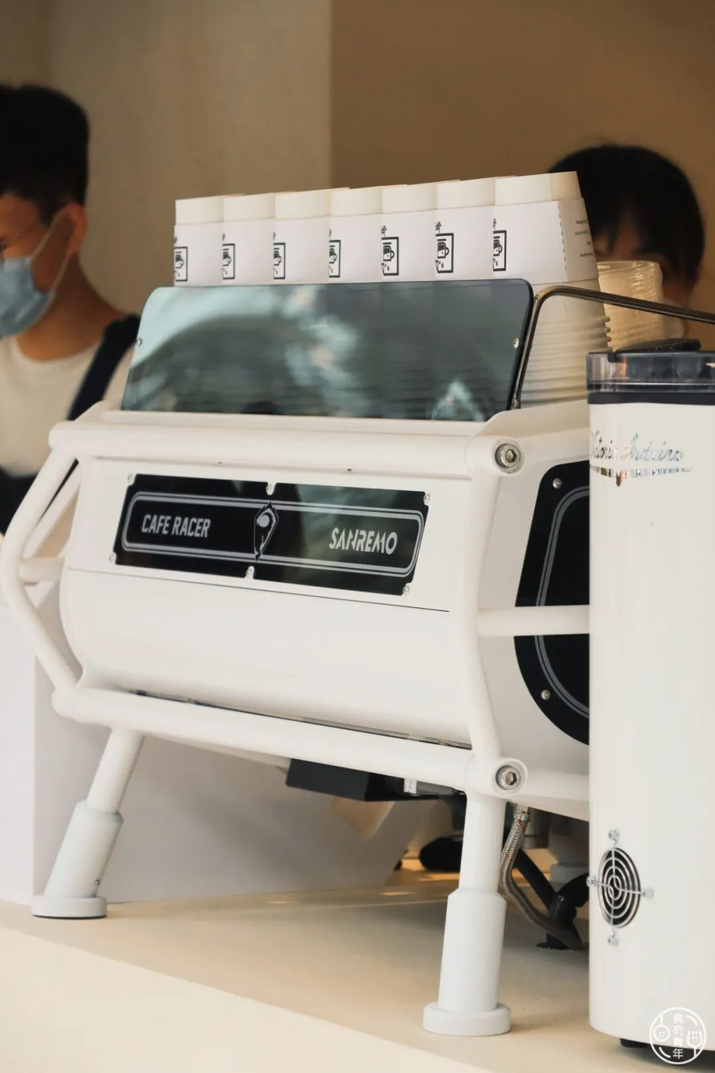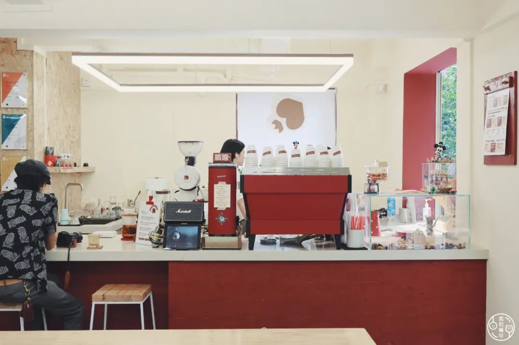 店内每个角落都细心布置着文化符号。店外的箱子座位适合站街摆拍,夏热时那大窗盖上薄膜让室内开空调。不得不提的是,吧台上面一台透明外壳的金属内壳咖啡机,看着像组装机,特别浪漫。