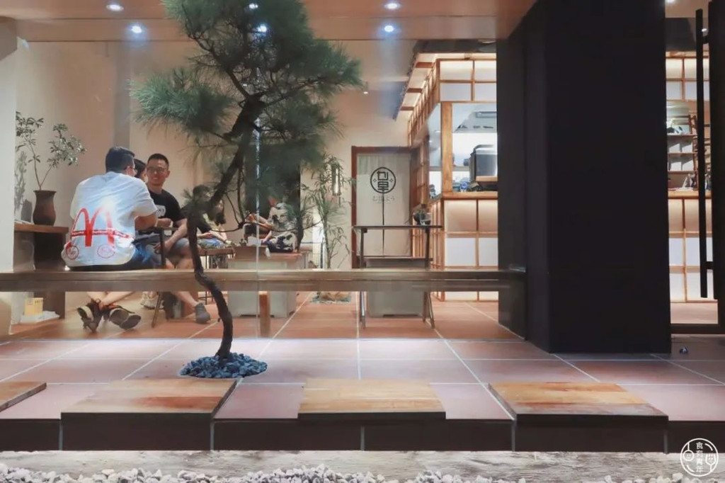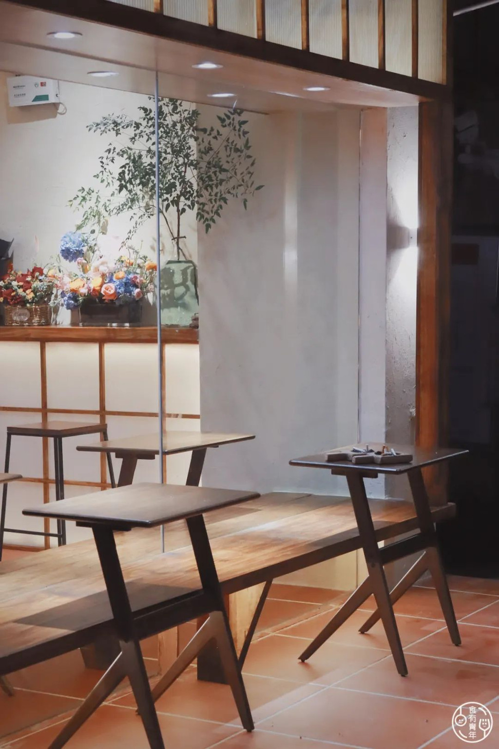 面朝门口的料理吧台,在街上透过玻璃清晰可见;门前松树有座,黑门引入明亮。入室向左是景观坐席,绿带隐形屏风,每桌皆有盆景;右靠吧台座位,与咖啡师面对面。据闻设计灵感来自一间拥有户外花园的日本寿司店。