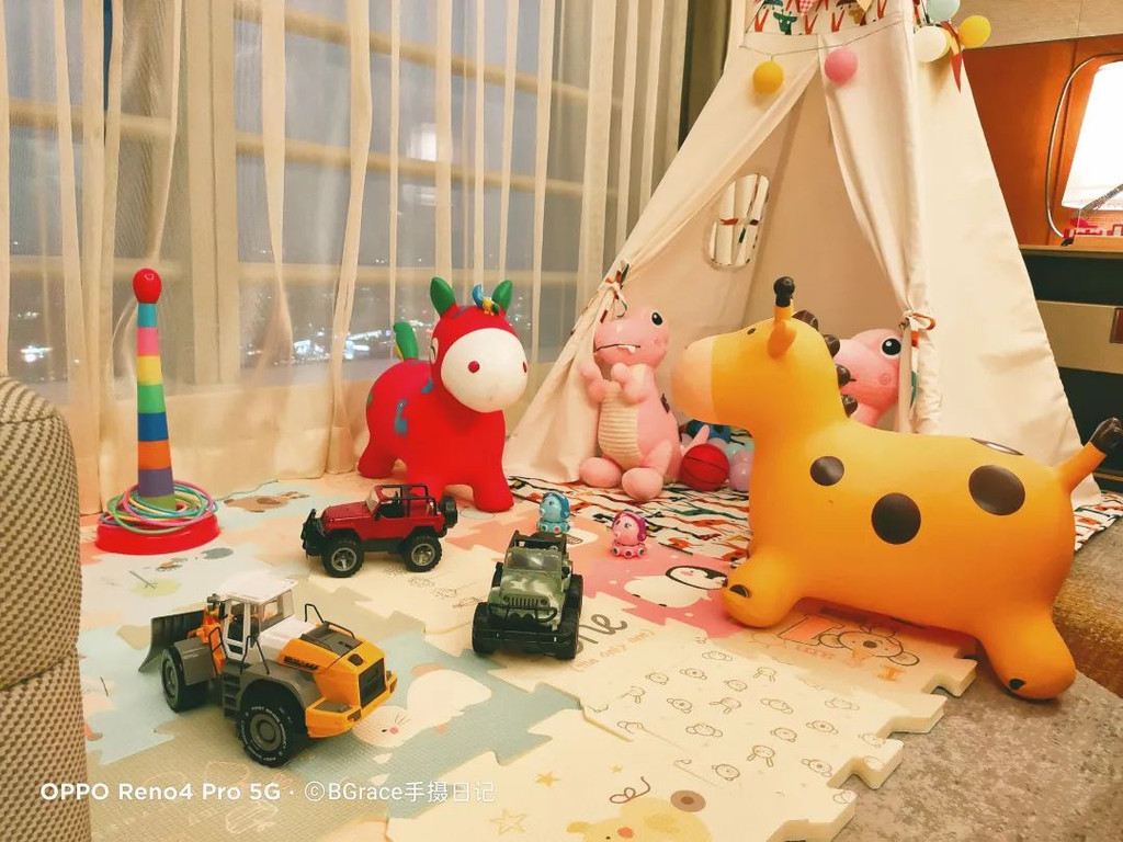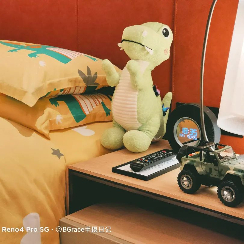 这里完完全全就是一个童真版的“侏罗纪公园”,有色彩艳丽QQ萌萌的恐龙公仔,有越野车模型(被恐龙追,可以坐车跑啊!)…… 从一打开房门开始,小朋友就已经彻底放飞了!