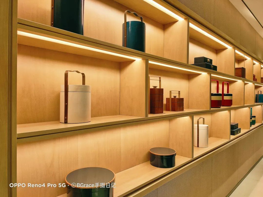 餐厅包房入口回廊的展架上摆放着古代食盒,储藏珍馐的器皿暗藏珍宝收藏之意。