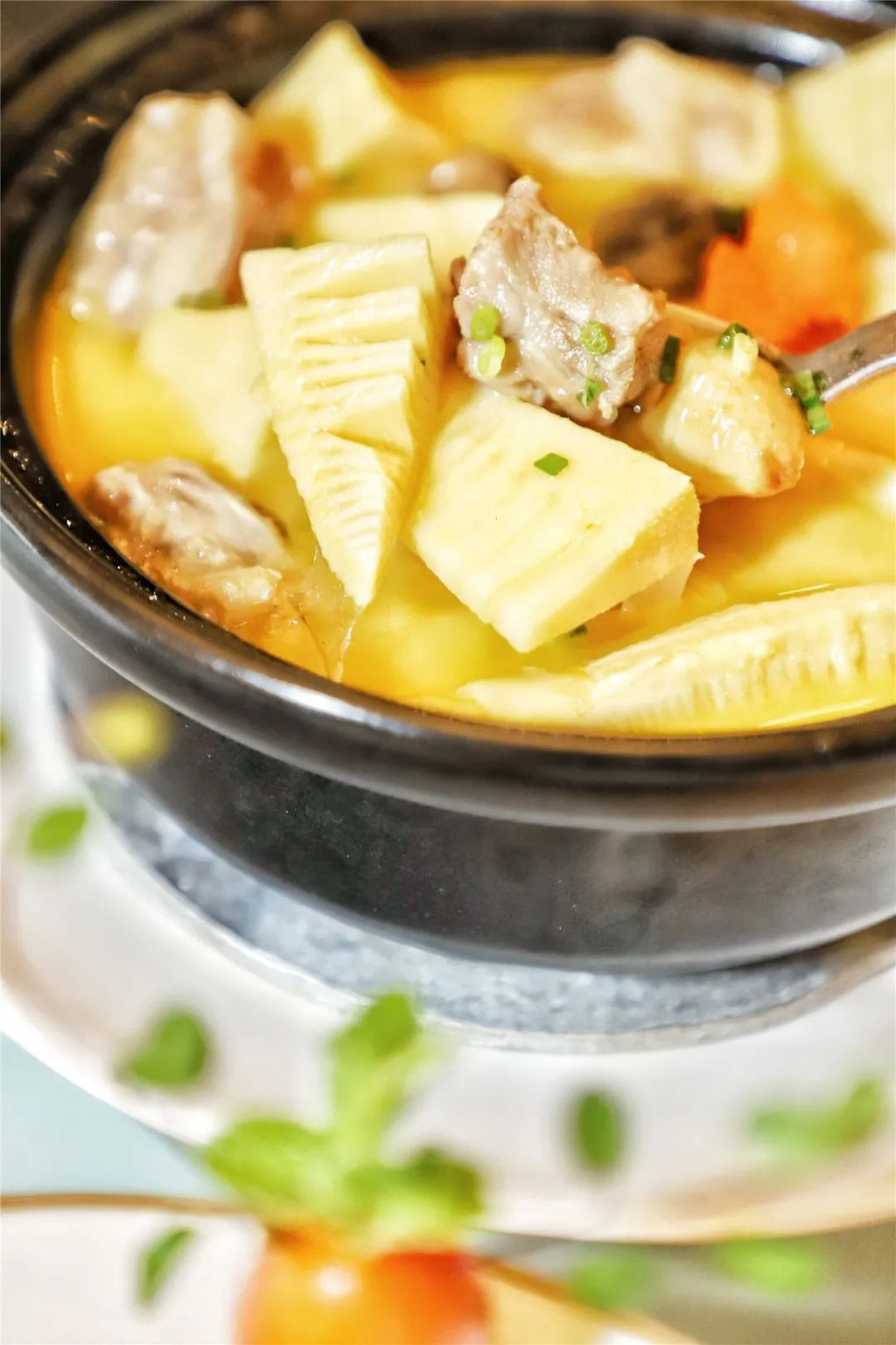 正值春暖花开时节,春意浓“食”,不时不食,中餐厅主厨把春天的新鲜味道都送到餐桌上了,结合传统粤菜的精髓,推陈出新,比如这道鸡汤咸骨春笋煲,春笋的脆、鲜成就了这一煲的“鲜活”。