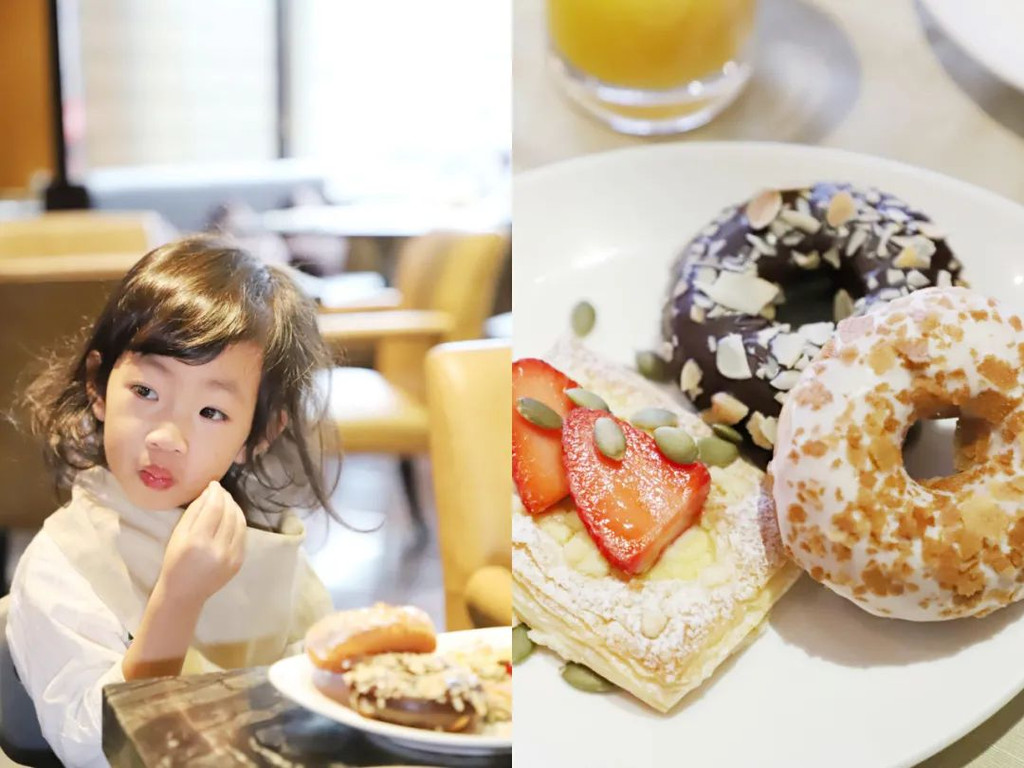 早餐时光,宝宝喜欢的牛角包,甜甜圈都能找到。