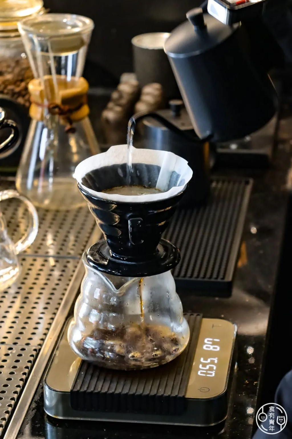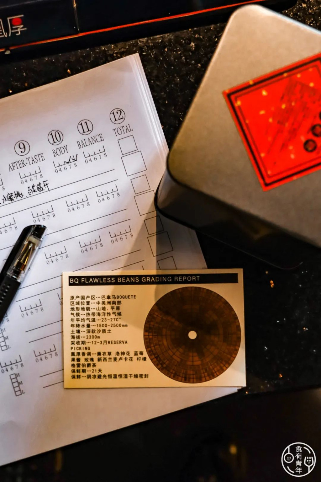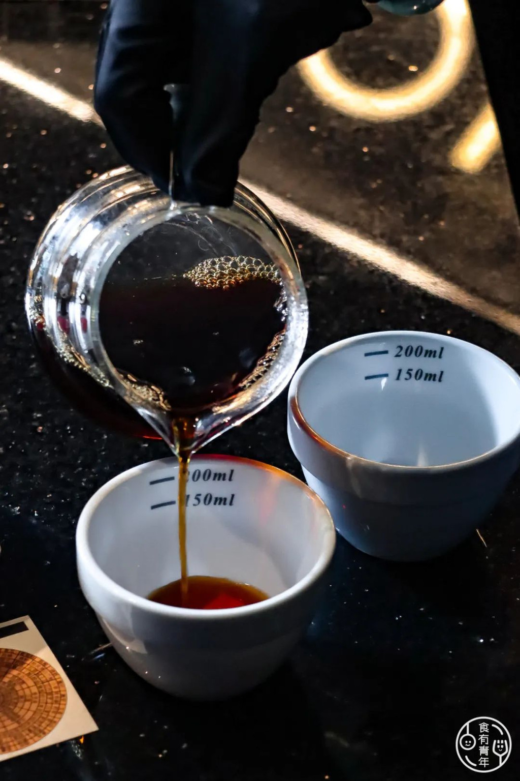 我最期待的环节,手冲过程浪漫的。看着开盖、秤豆、磨豆,娴熟地完成冲煮过程;喝前有一杯16摄氏度水簌口,喝后有类似杯测的品味记录环节。