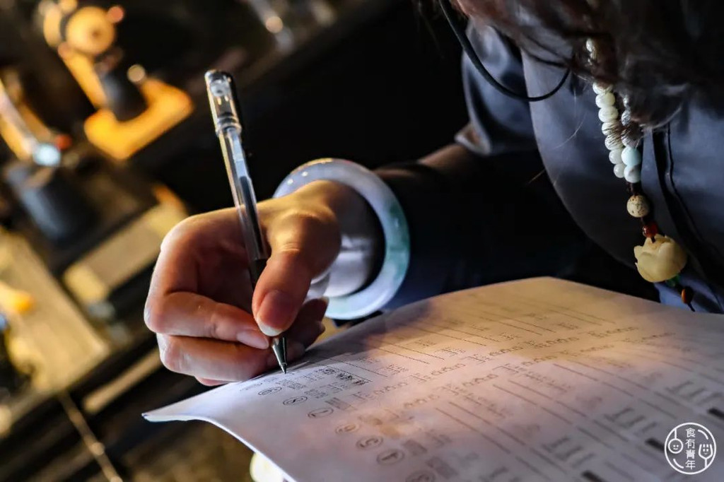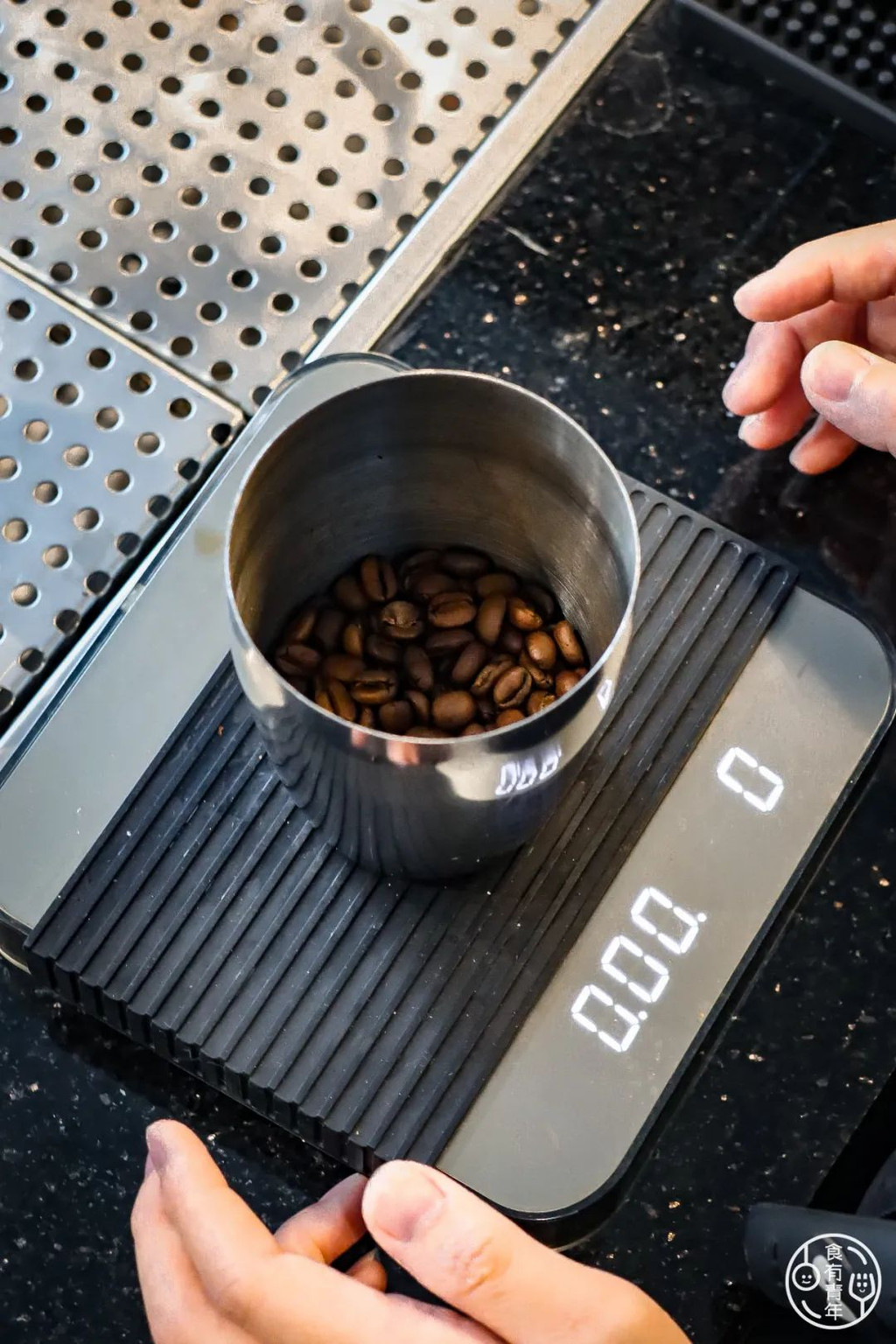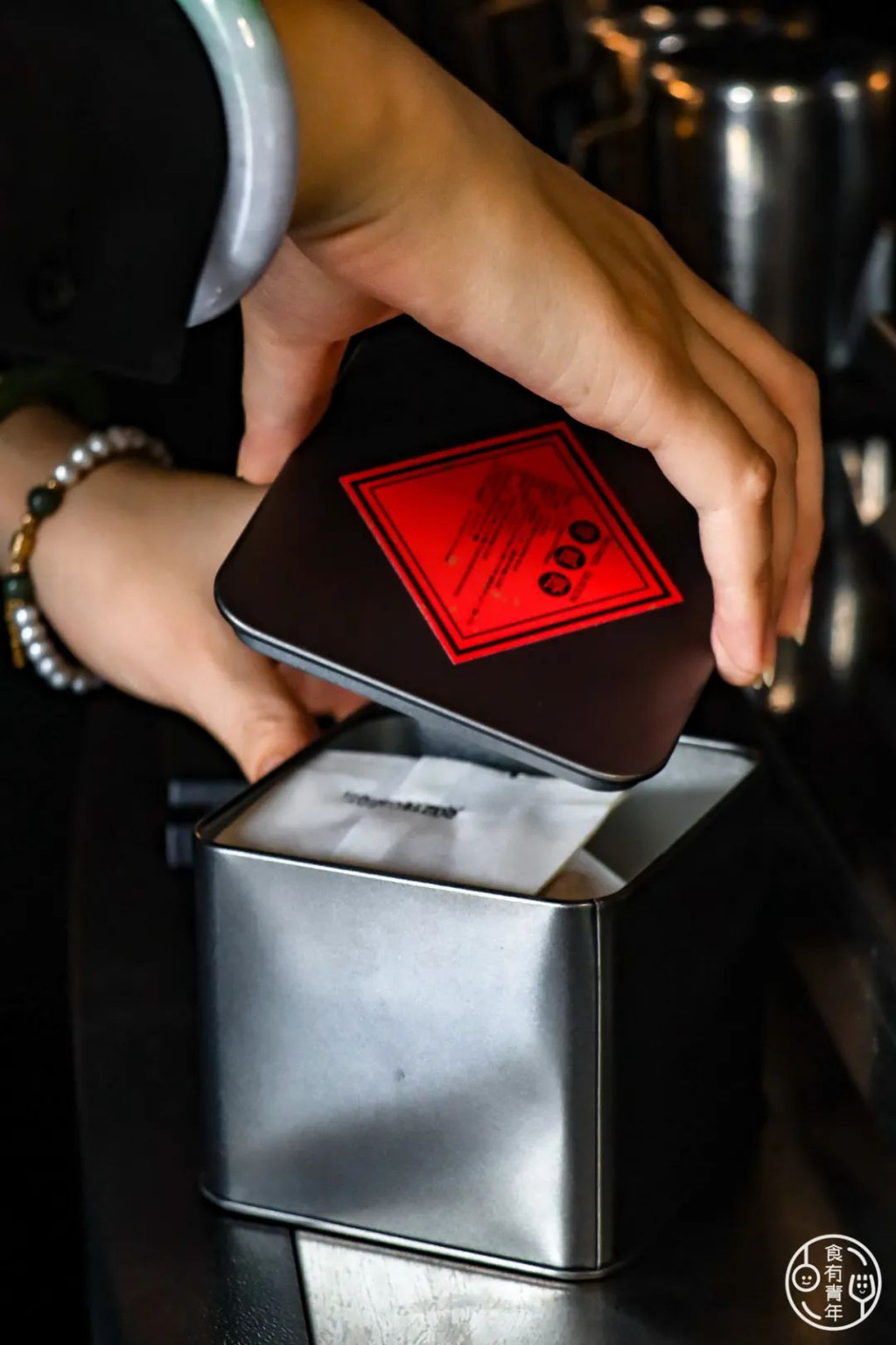 我最期待的环节,手冲过程浪漫的。看着开盖、秤豆、磨豆,娴熟地完成冲煮过程;喝前有一杯16摄氏度水簌口,喝后有类似杯测的品味记录环节。